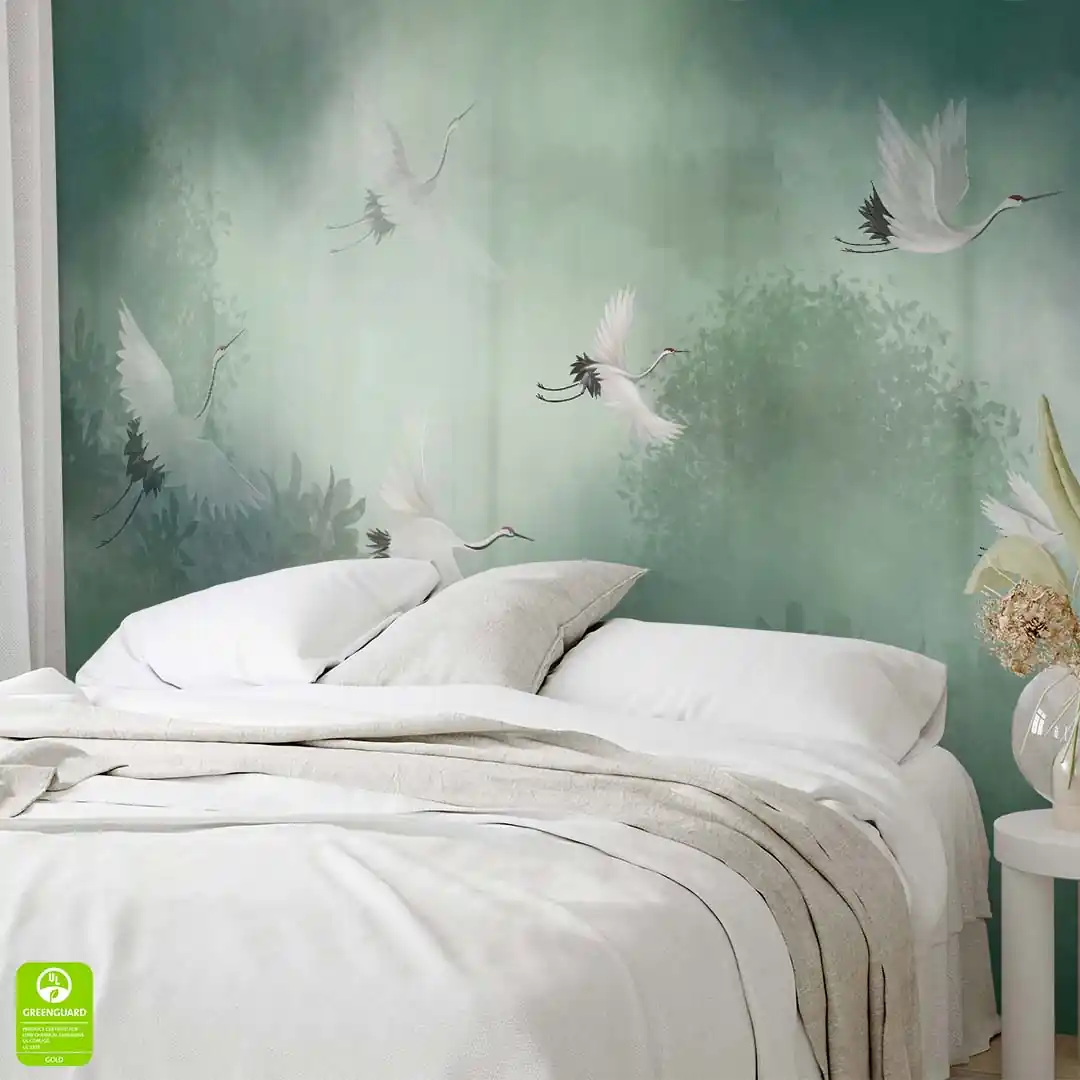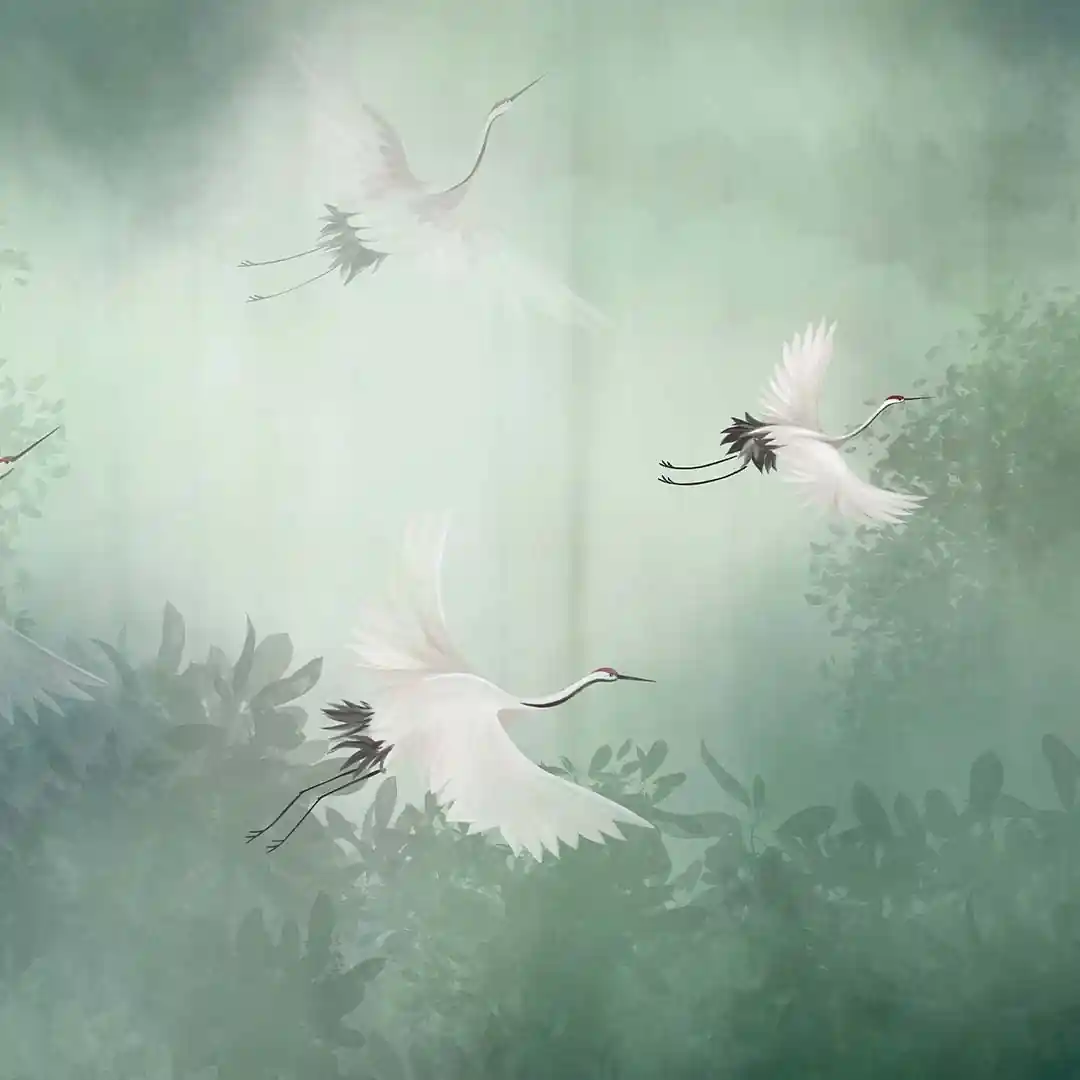 Fototapeta Żurawie zielony las we mgle na wymiar — do sypialni salonu, styl orientalny nowoczesny, zielona biała