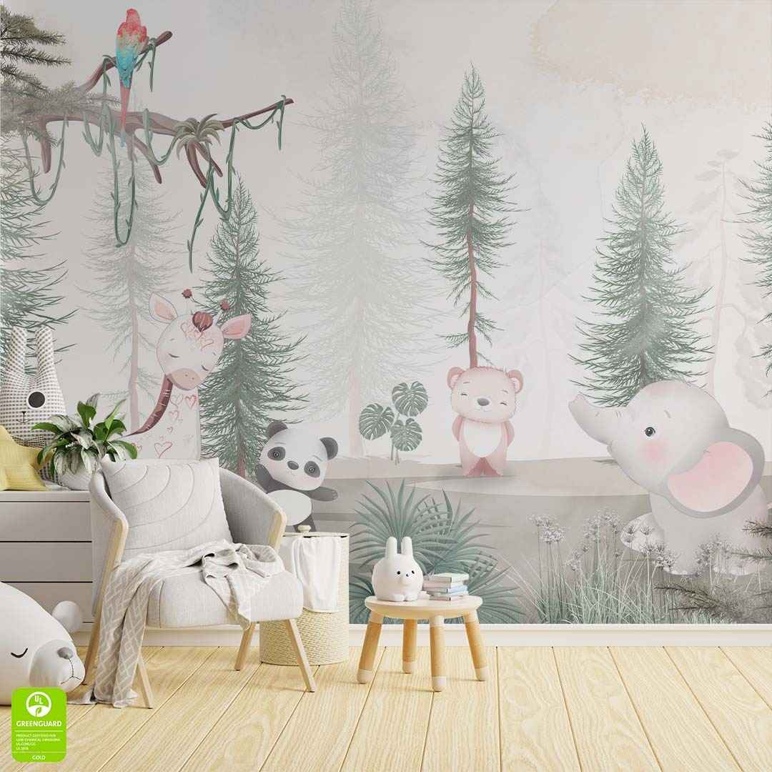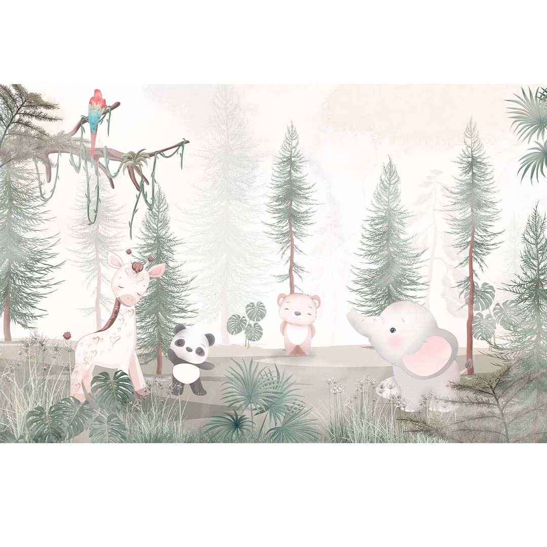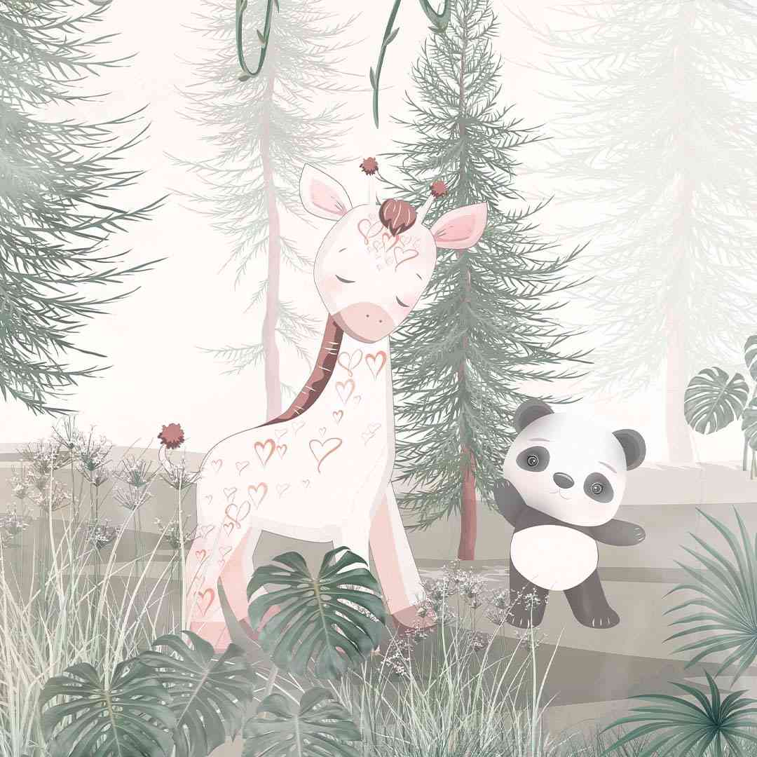 Fototapeta - Miś panda słoń żyrafa w lesie do pokoju dziewczynki chłopca na wymiar - pastelowa, styl skandynawski