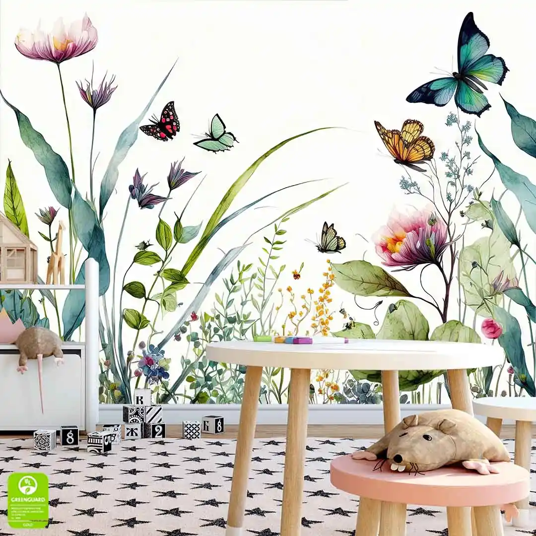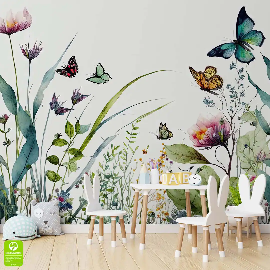 Motyw został specjalnie zaprojektowany z myślą o najmłodszych. Fototapeta na ścianach pokoju dziecięcego zachęca do zabawy i inspiruje do kreatywności. Inspiracje wykorzystane przy tworzeniu tej fototapety to: łąka, pola, kwiaty, motyle oraz rośliny. Wzór nie ma super ostrych i wyrazistych konturów, dzięki czemu ma oryginalny i subtelny charakter - jest to efekt zamierzony przy tym projekcie graficznym.