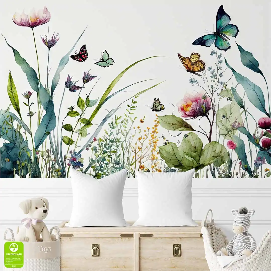 Fototapeta - Urocza łąka - kolorowe kwiaty motyle do pokoju dziewczynki na wymiar pastelowa, styl skandynawski boho