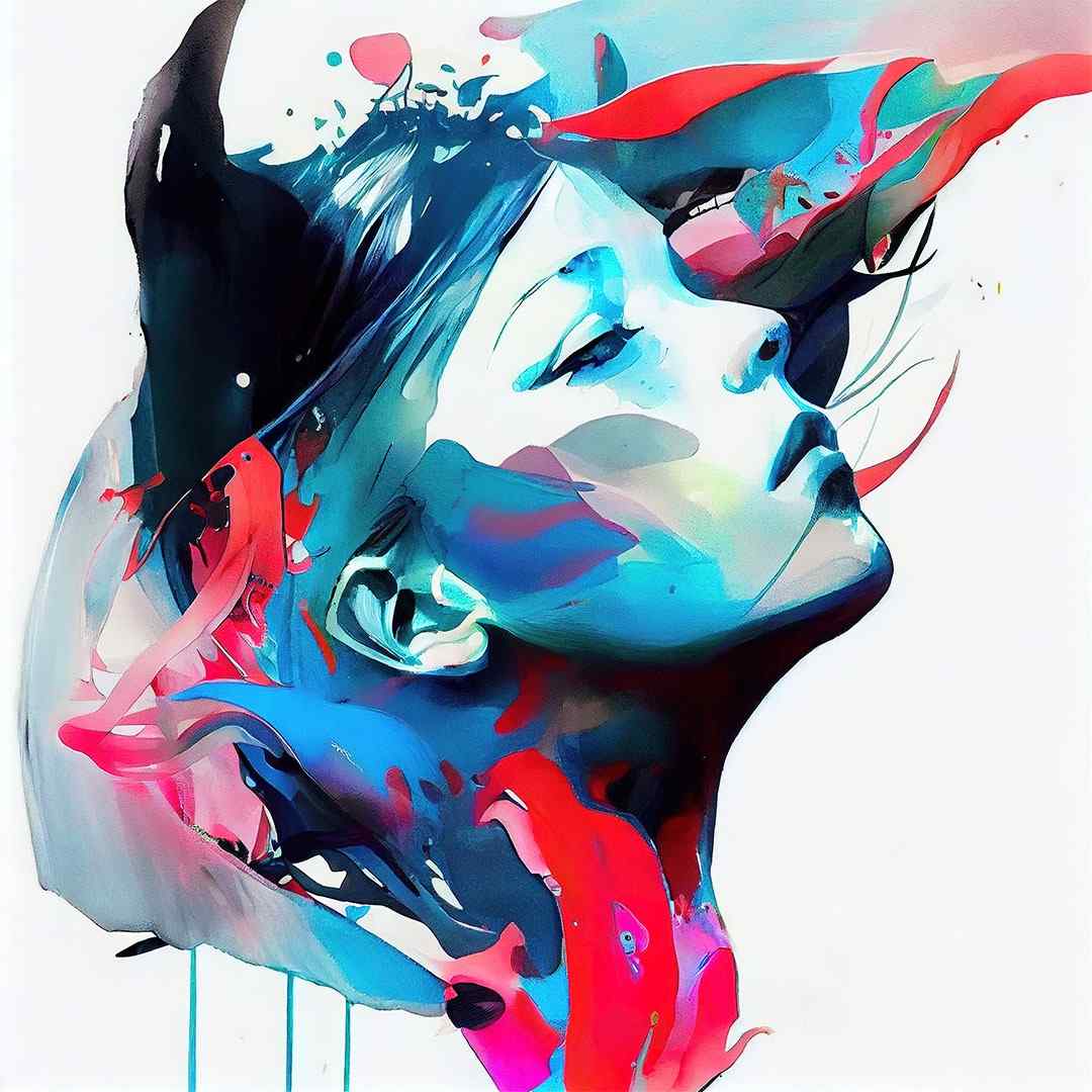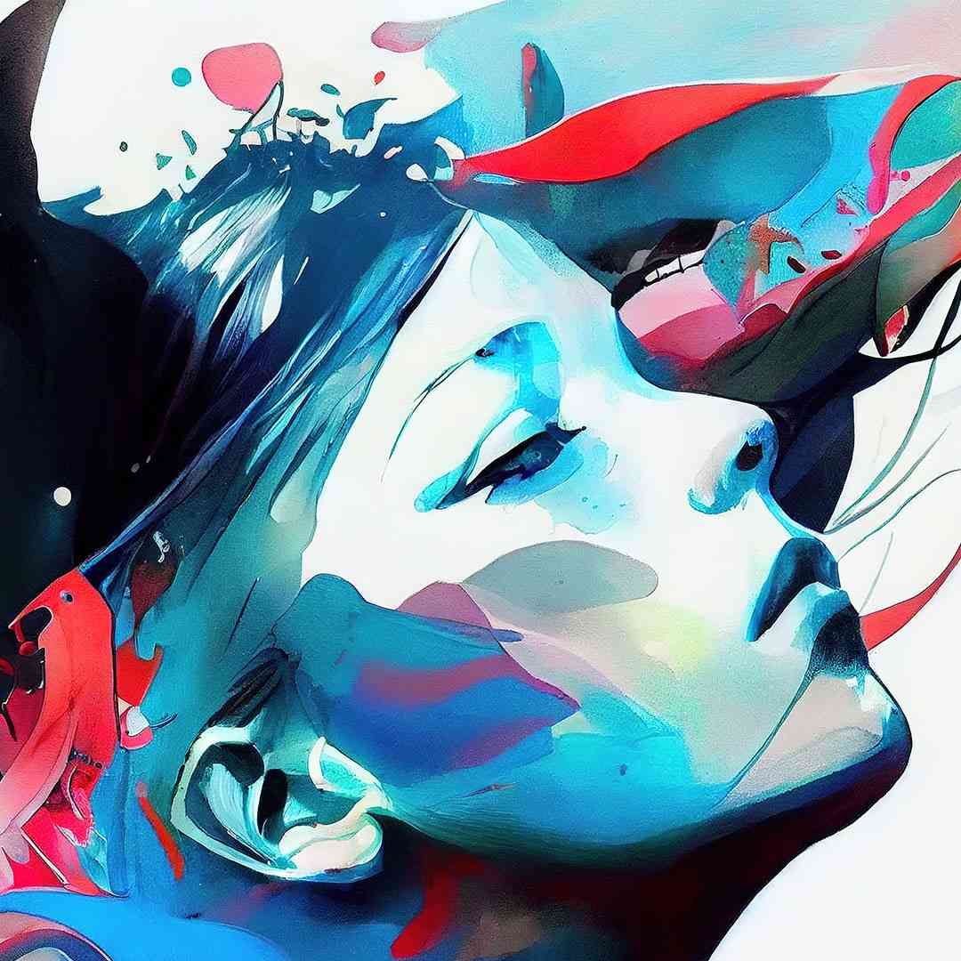 Fototapeta na wymiar: Abstrakcyjny Portret Kobiety – Nowoczesny styl malarski i akwarela, Artystyczny salon i sypialnia, Niebiesko-Czerwona, Styl Nowoczesny industrialny