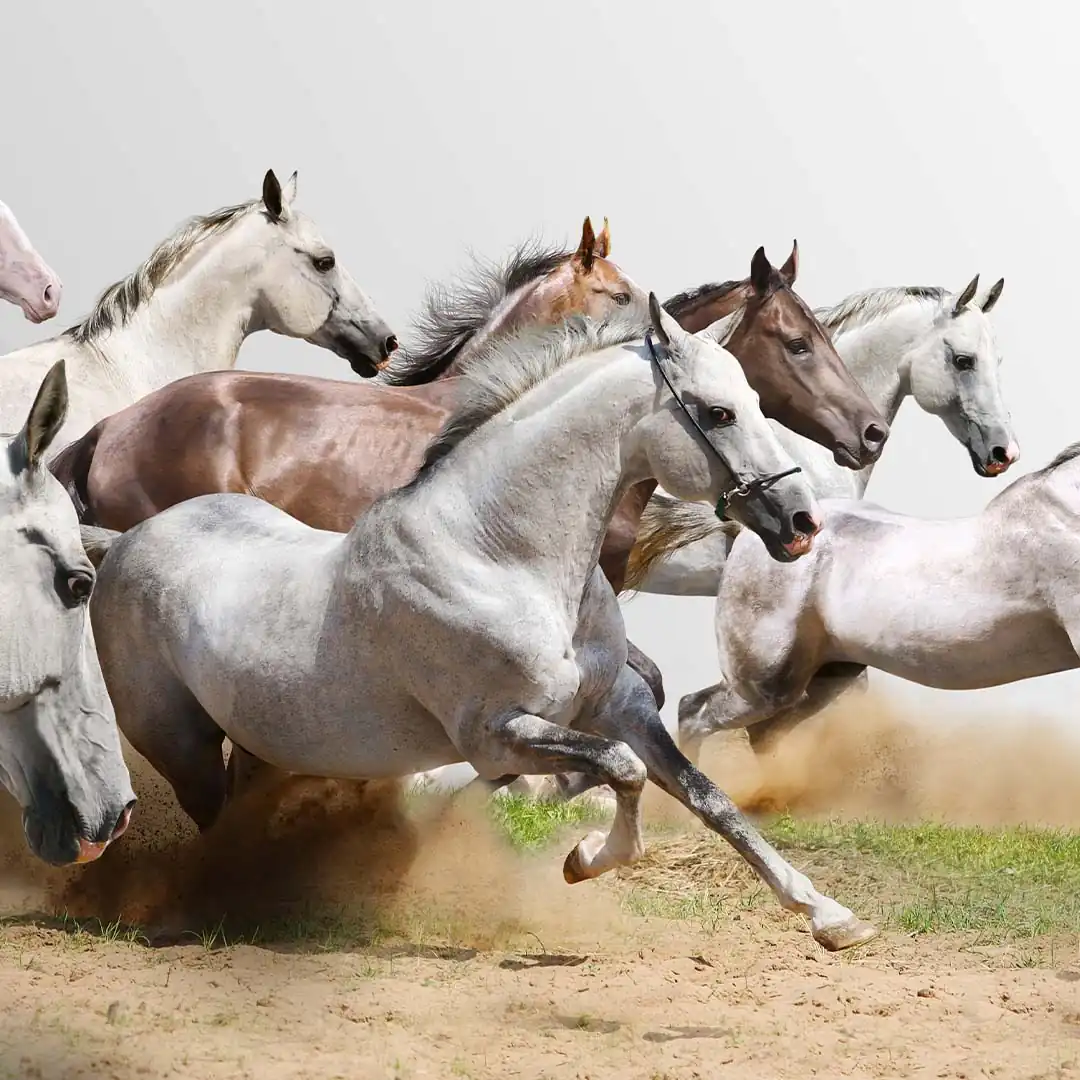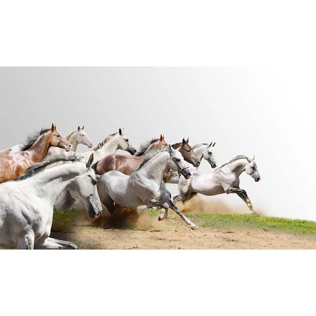 Fototapeta konie w galopie białe stado na wymiar — do salonu sypialni gabinetu, styl rustykalny boho nowoczesny, szara beżowa