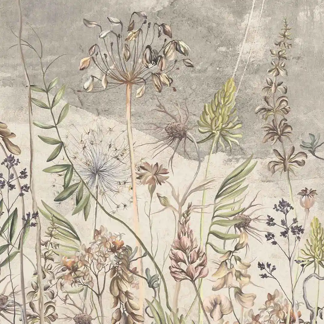 Fototapeta na wymiar – łąka pełna polnych kwiatów w stylu vintage, botaniczna dekoracja ścienna do salonu lub jadalni