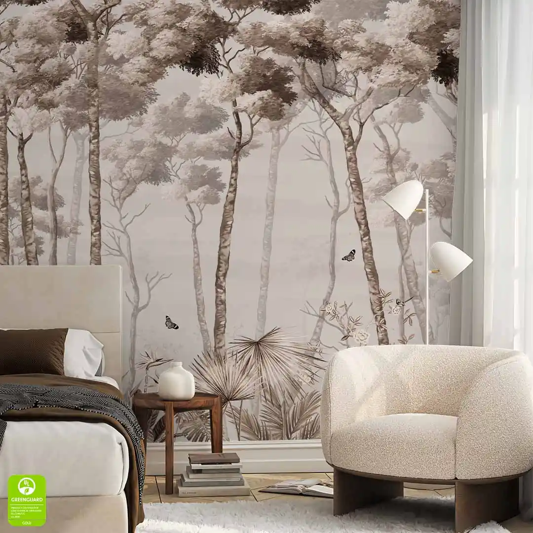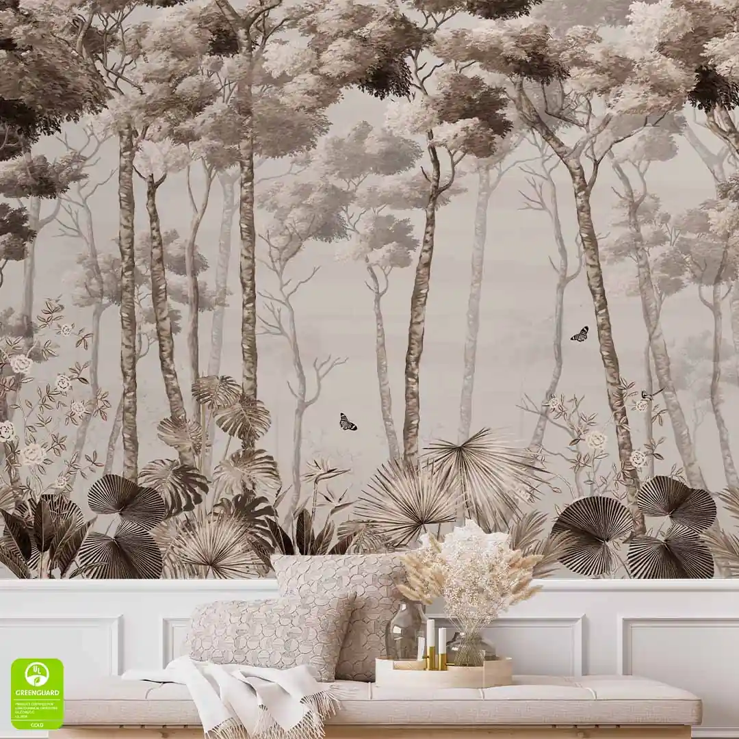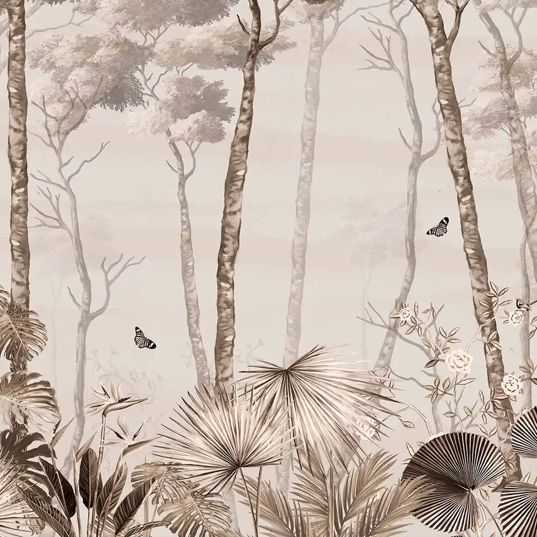 Fototapeta na Wymiar Pejzaż leśny we Mgle w Odcieniach Beżu i Brązu, Sepia, Kolory Ziemi