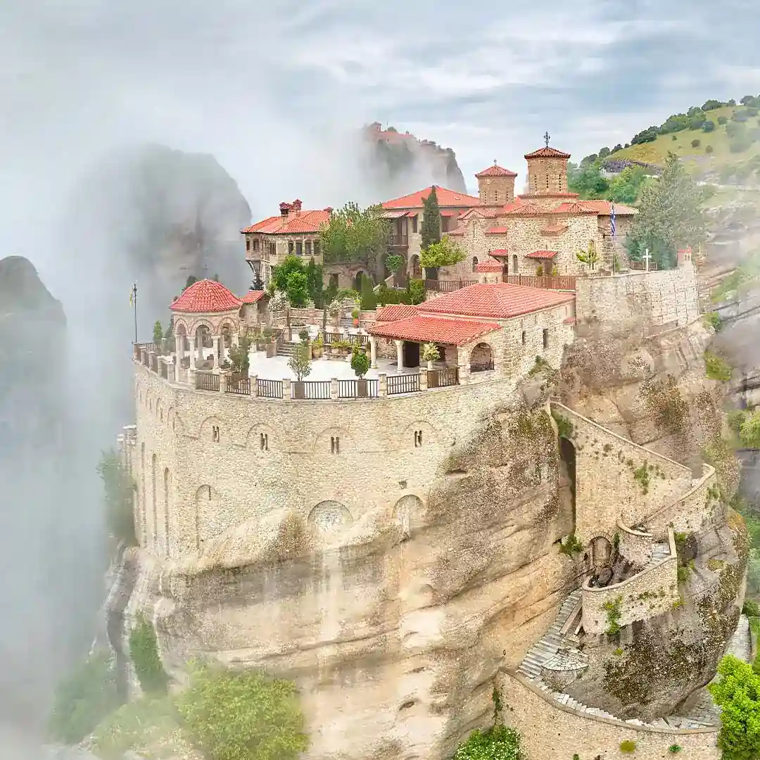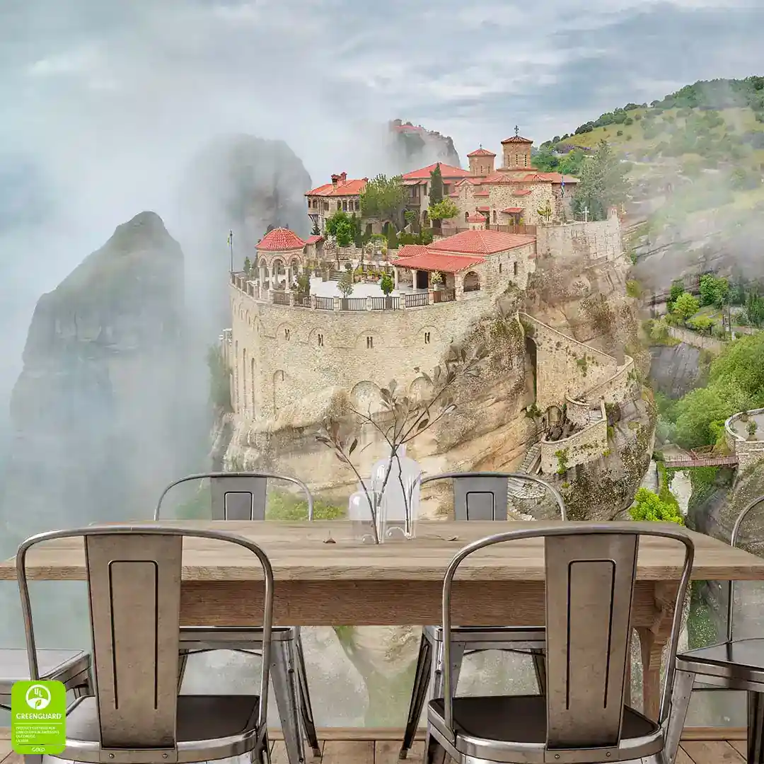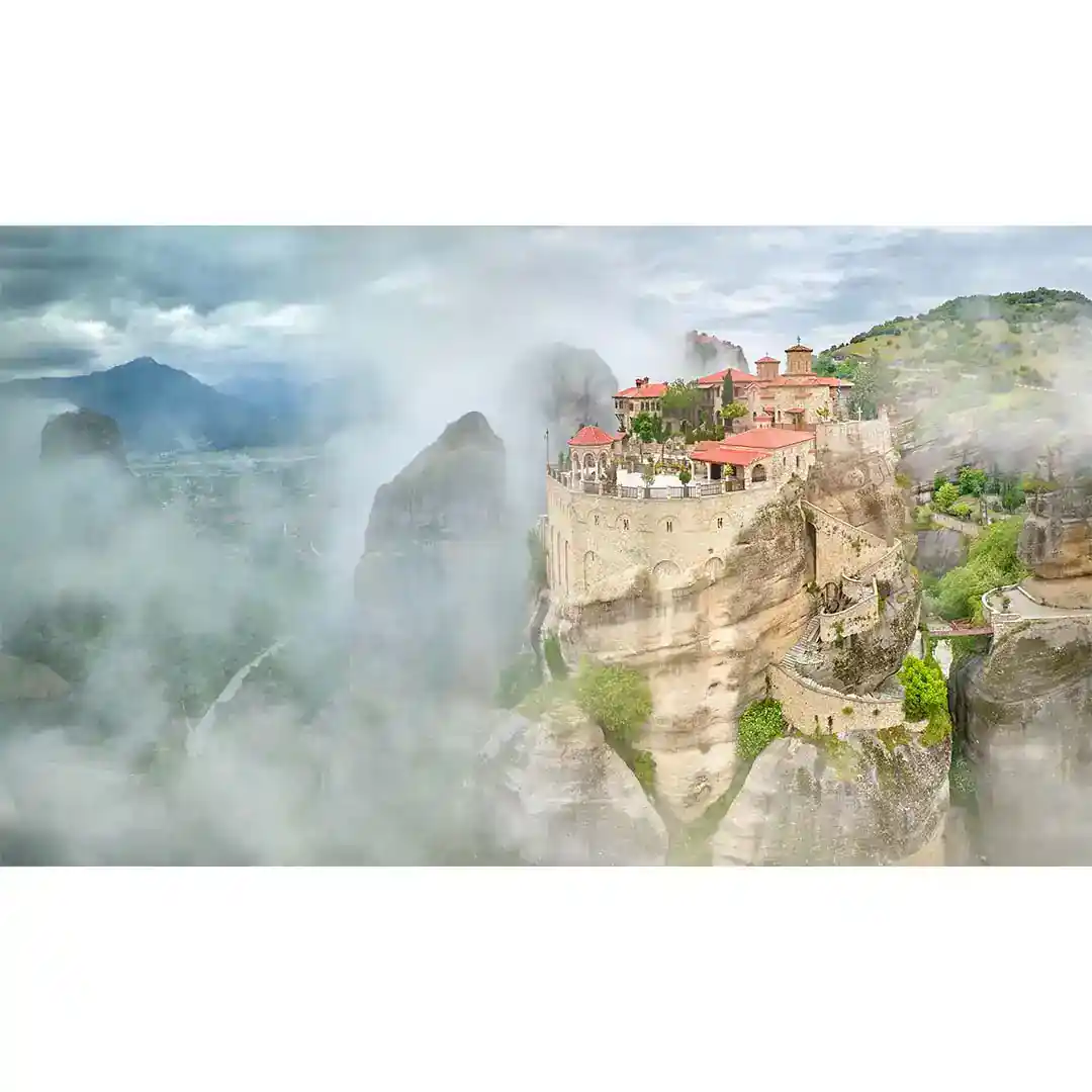 Fototapeta Meteory Grecja - Widok na klasztor w chmurach, Beżowa na wymiar, Salon i Jadalnia, Styl Boho i Nowoczesny