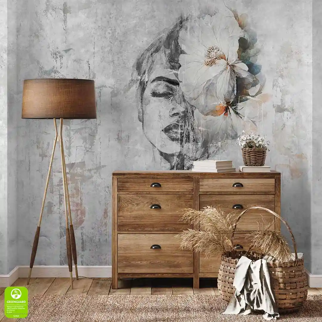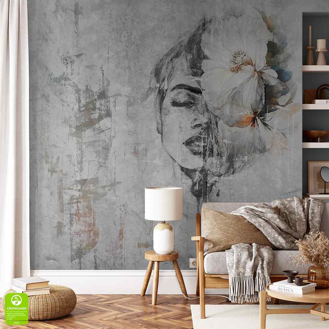 Fototapeta artystyczna - Twarz kobiety z kwiatem na wymiar - szara beton, styl nowoczesny industrialny