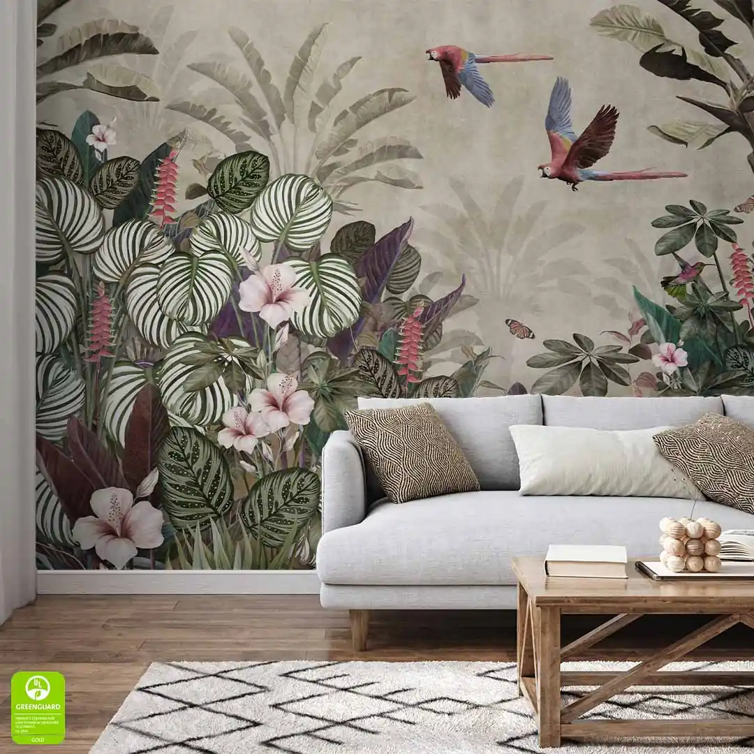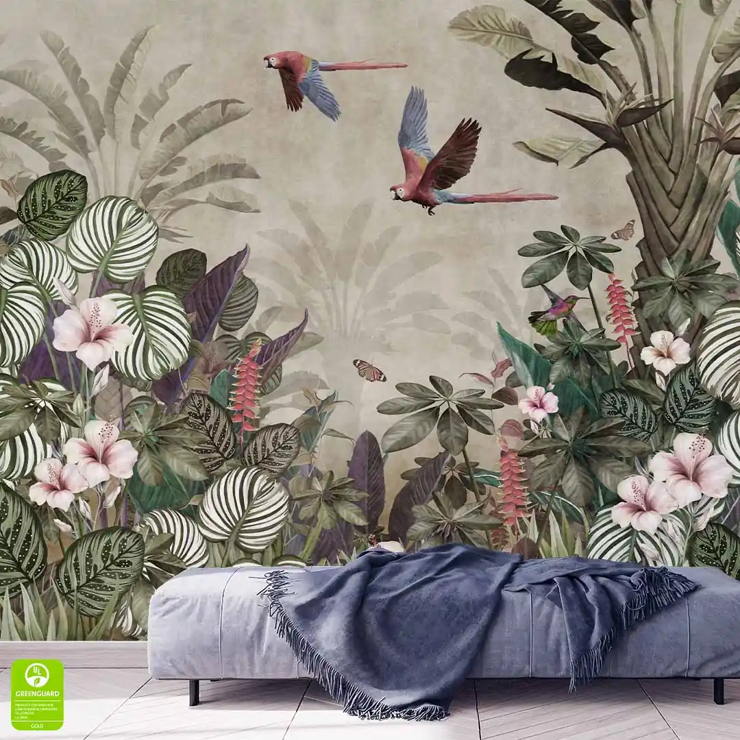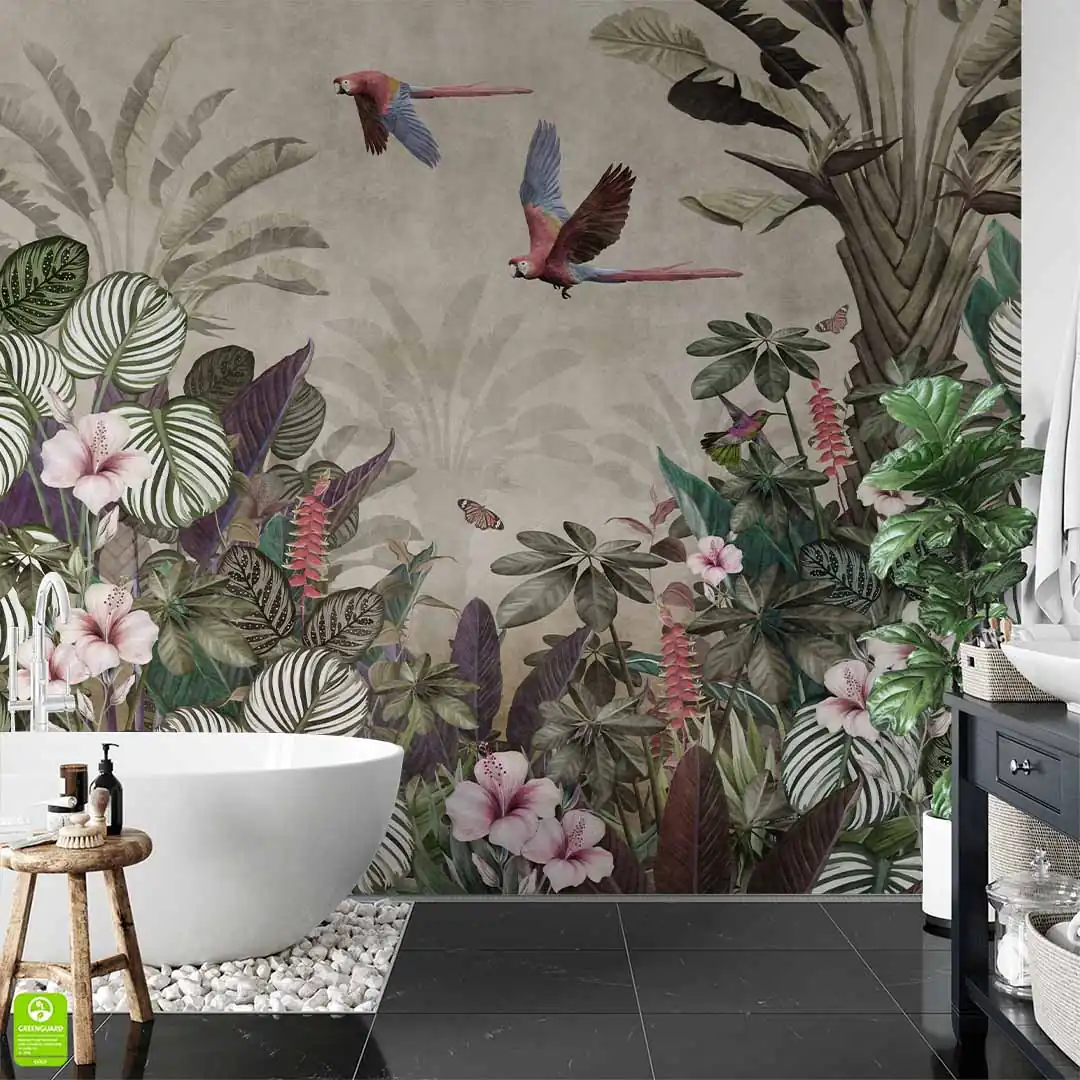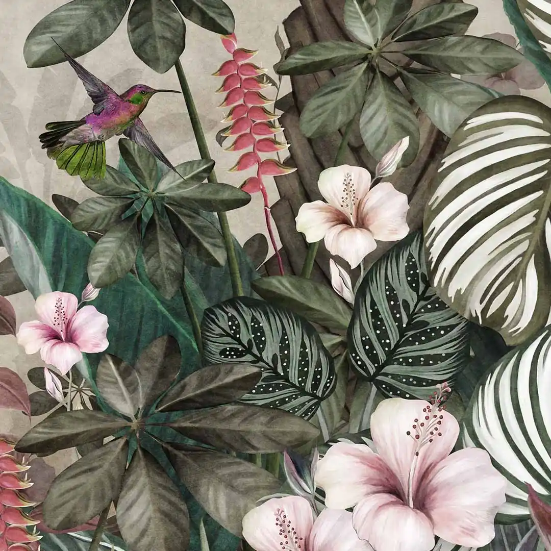 Fototapeta na wymiar Vintage Tropikalny Las – Papugi, Koliber i Kwiaty Hibiskusa