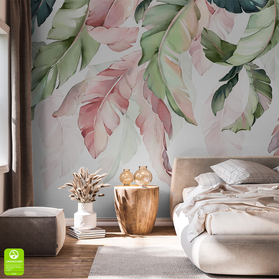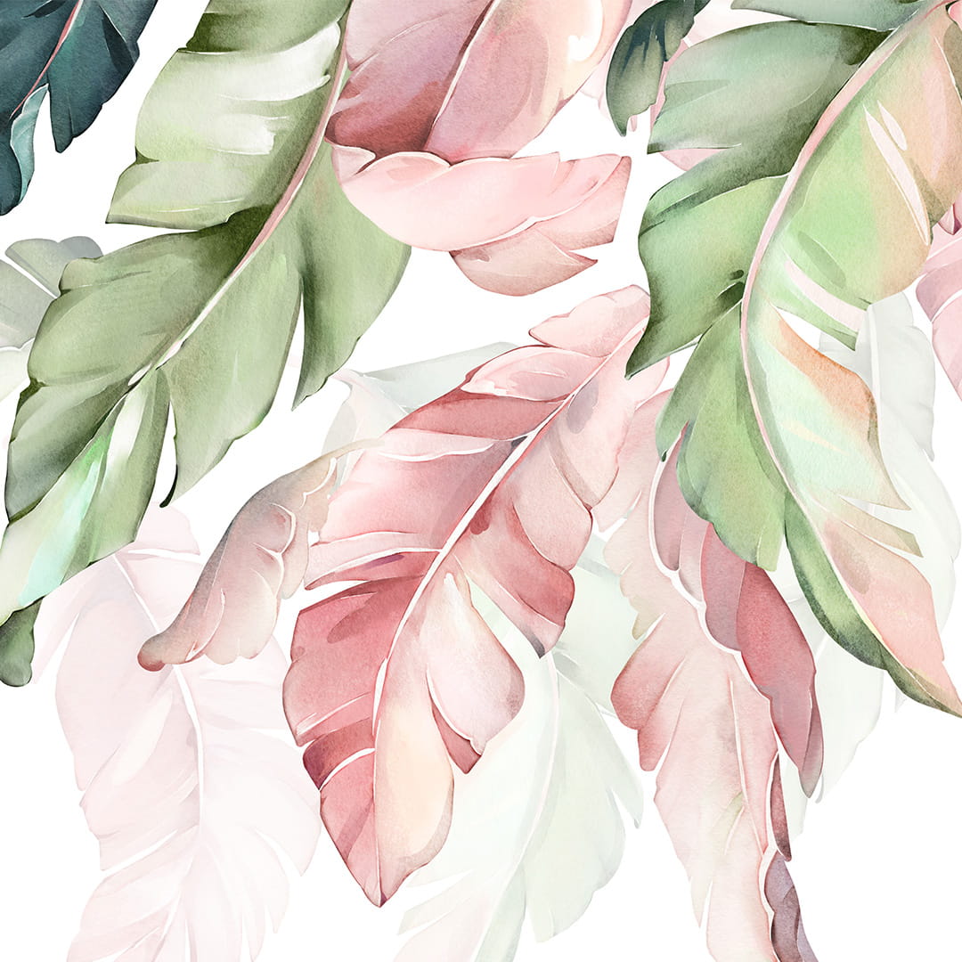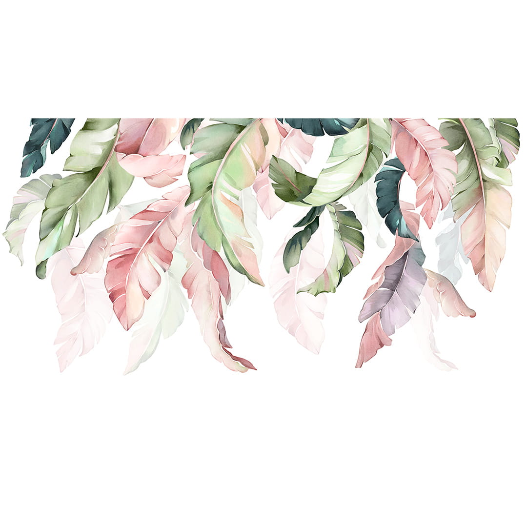 Fototapeta na wymiar „Kolorowe zwisające liście bananowca” – pastelowy motyw roślinny do sypialni, salonu lub pokoju w stylu boho i naturalnym