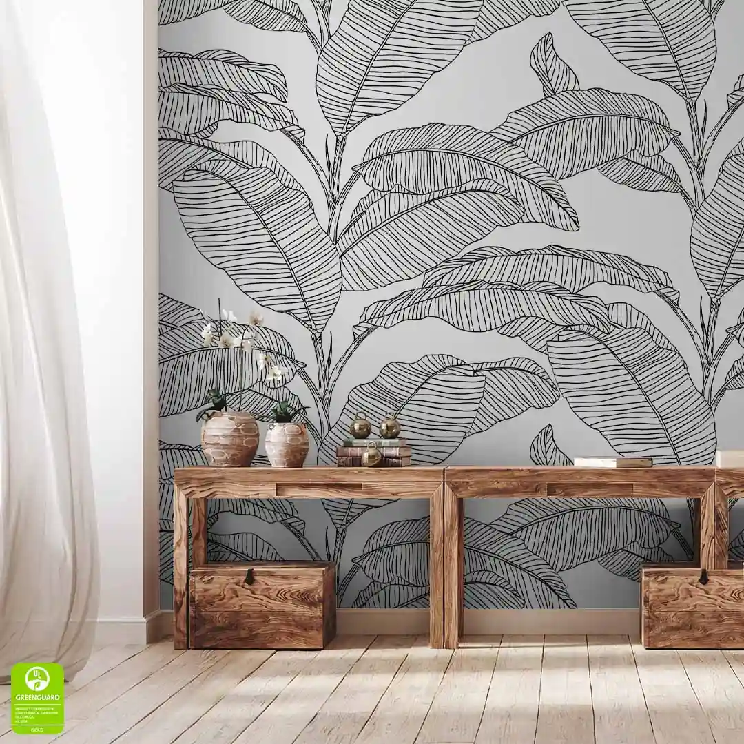 Fototapeta na wymiar – czarno-białe liście bananowca, tropikalny line art w stylu minimalistycznym, dekoracja ścienna do salonu, jadalni lub gabinetu