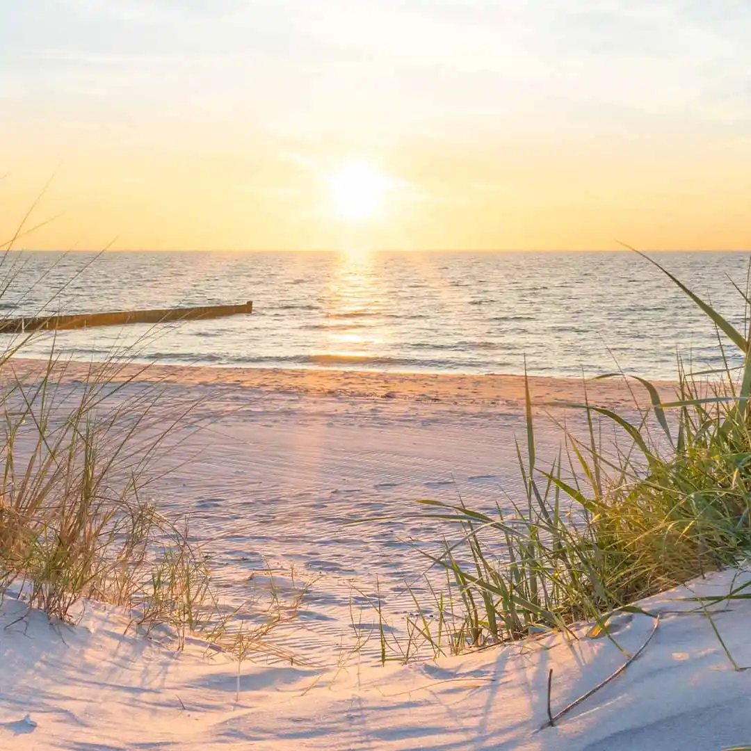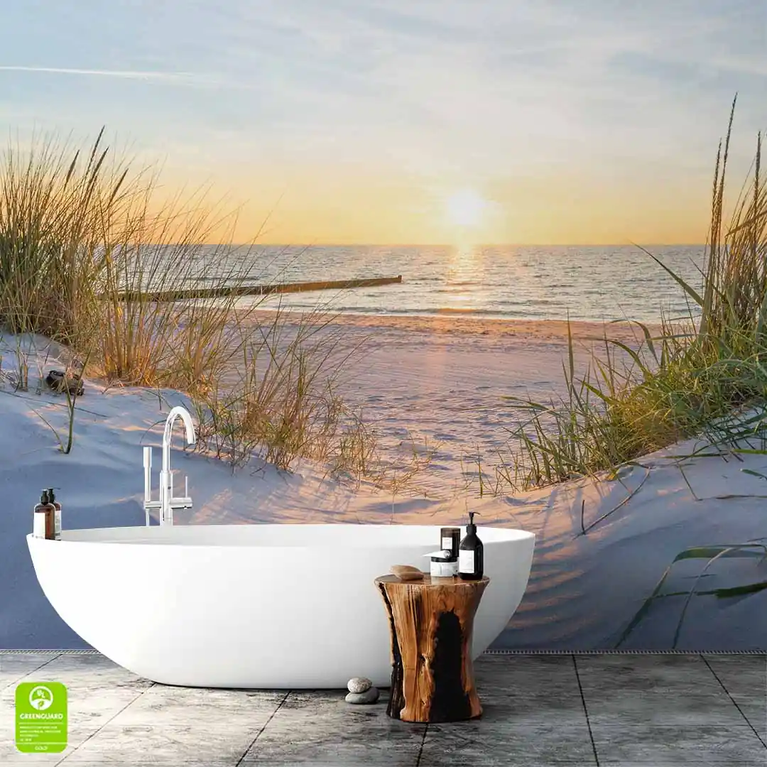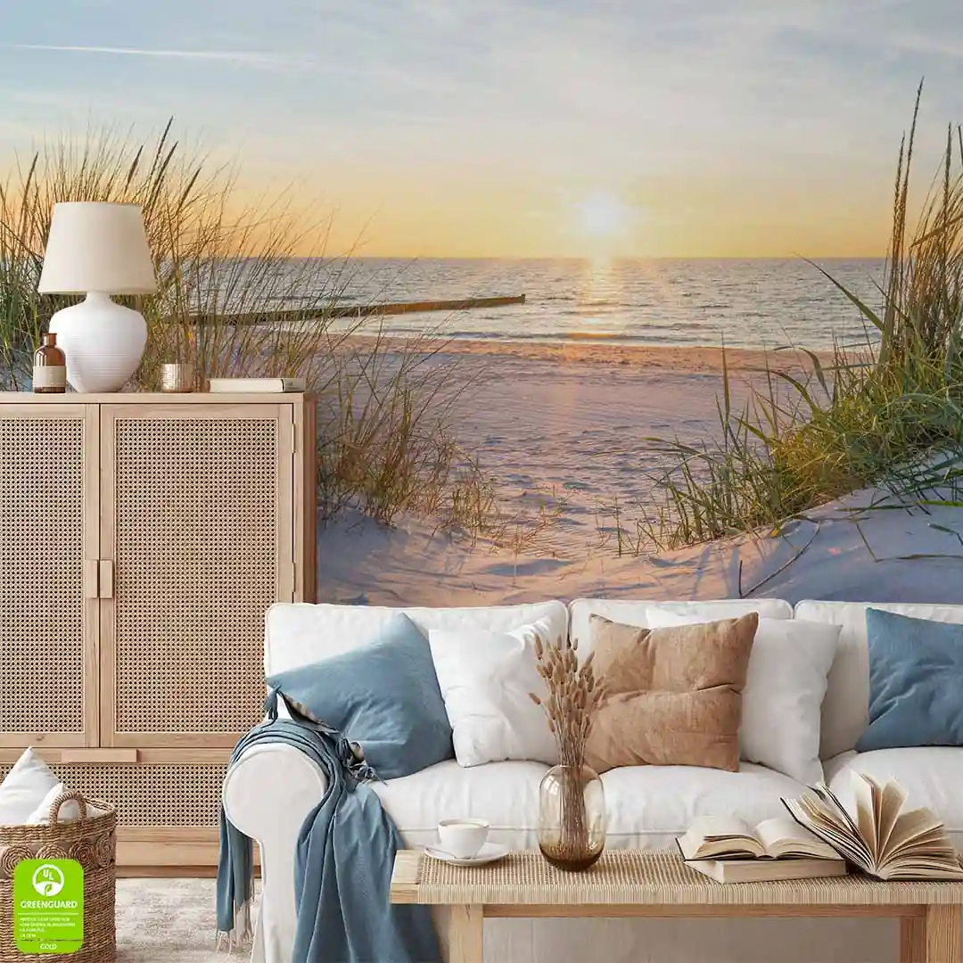 Fototapeta na wymiar "Zachód słońca nad morzem" to idealny sposób na zatrzymanie letnich wspomnień w Twoim domu. Wzór przedstawia malowniczą, piaszczystą plażę z delikatnymi kępami traw morskich na wydmach, skąpaną w miękkim świetle zachodzącego słońca. Perspektywa uciekająca w stronę morskiego horyzontu sprawia, że wnętrze zyskuje niesamowitą głębię i wydaje się znacznie większe.