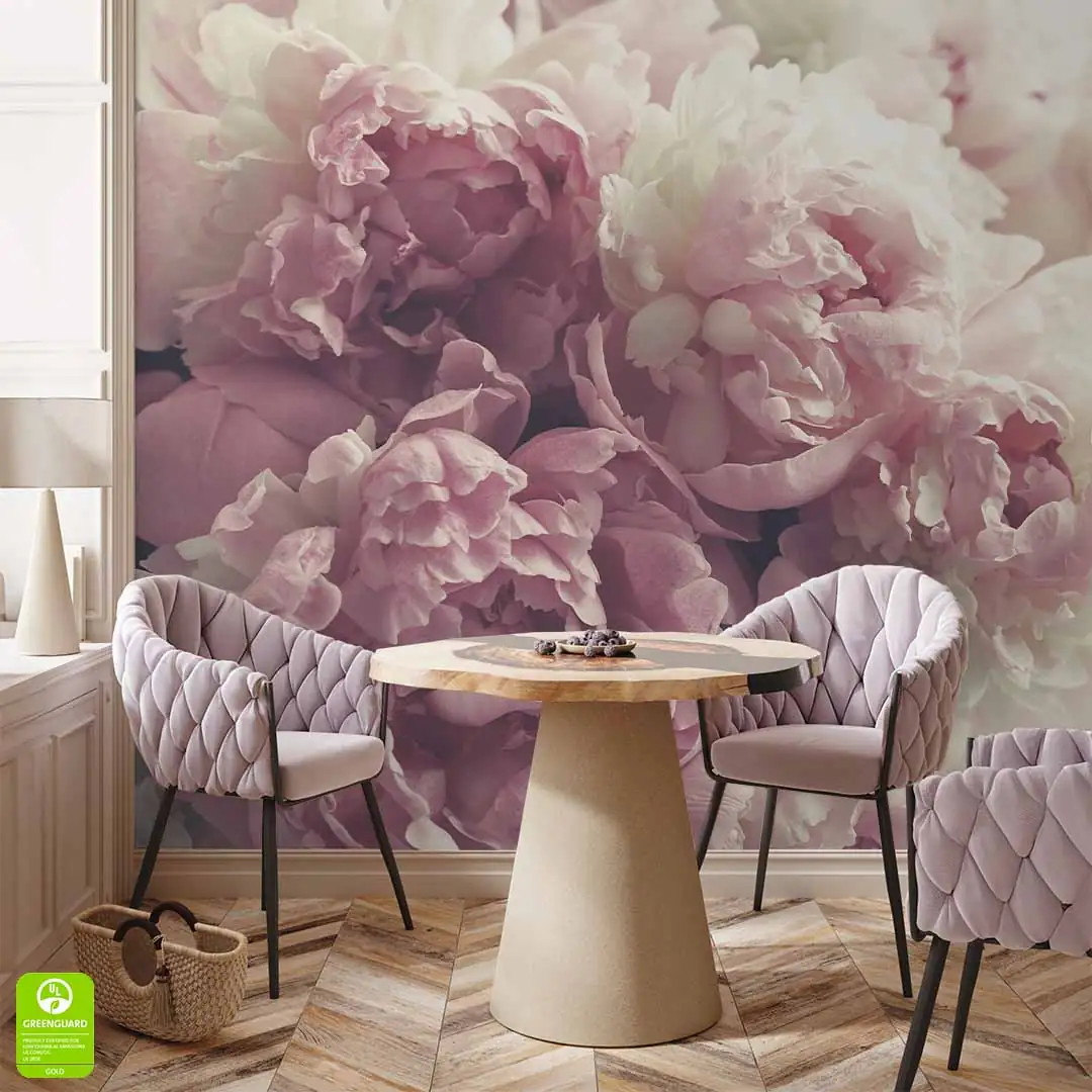 Fototapeta Piwonie – Kwiatowe tło na ścianę to idealny sposób na subtelną metamorfozę
