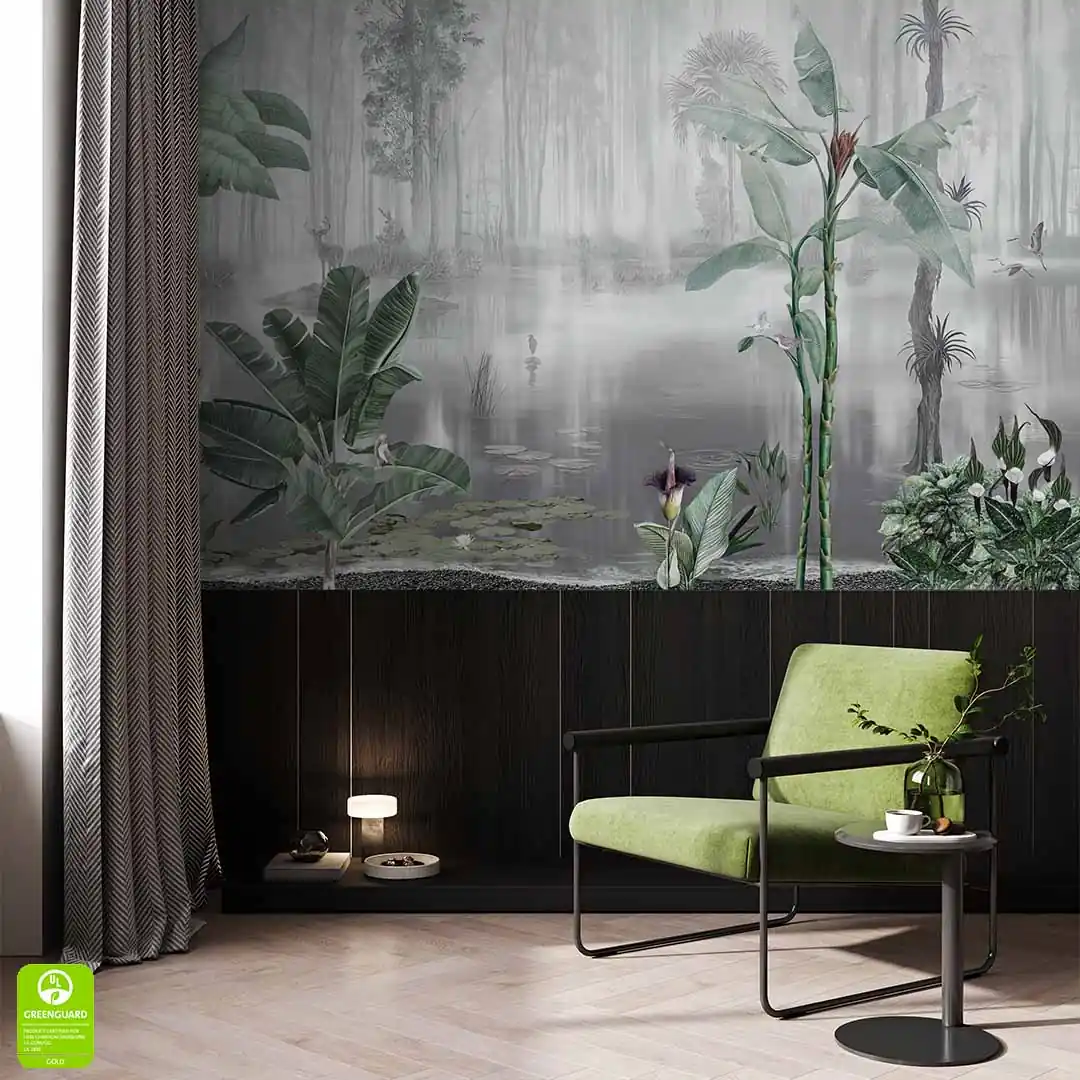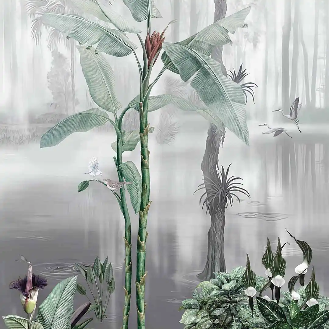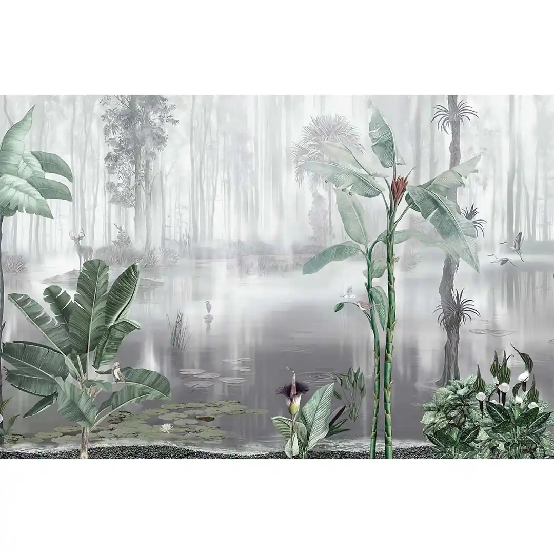 Fototapeta na wymiar – tropikalny krajobraz z mgłą o poranku, nastrojowy widok na jezioro i roślinność do salonu, jadalni lub gabinetu