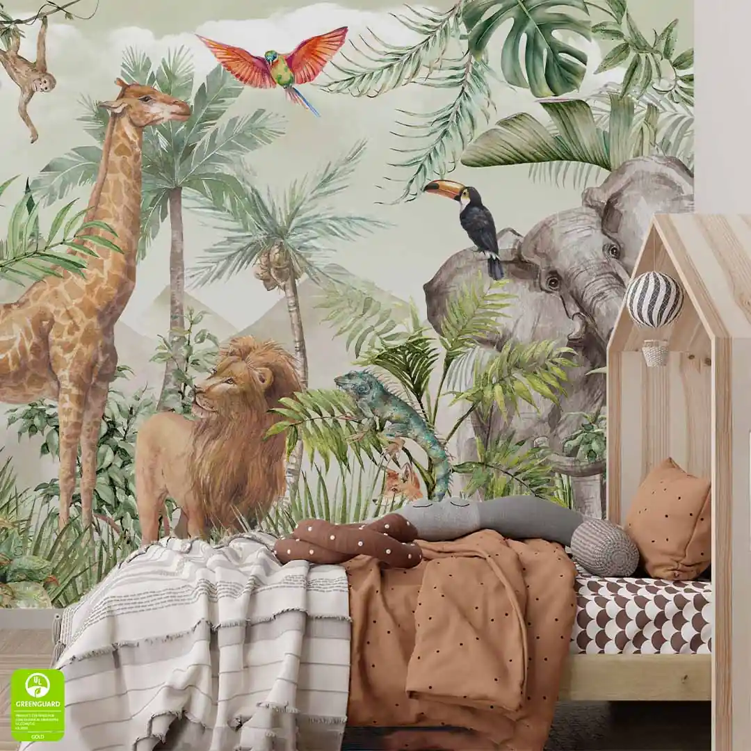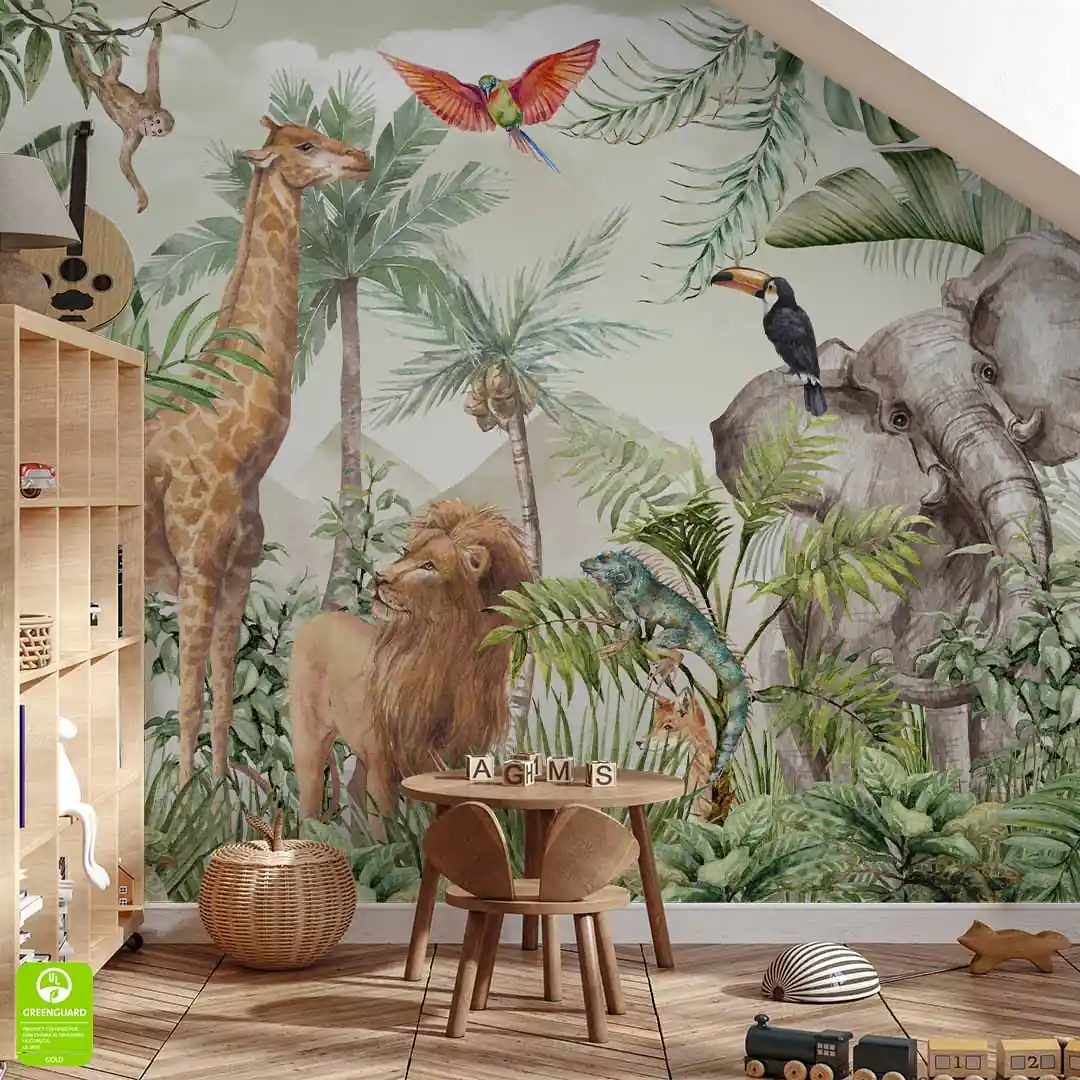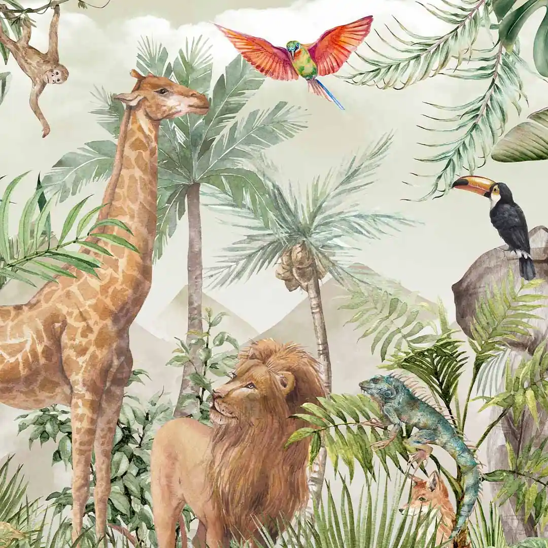 Fototapeta na wymiar – dekoracyjna tapeta ścienna z dżunglą, lwem, żyrafą i egzotycznymi zwierzętami do pokoju dziecięcego lub przedszkola