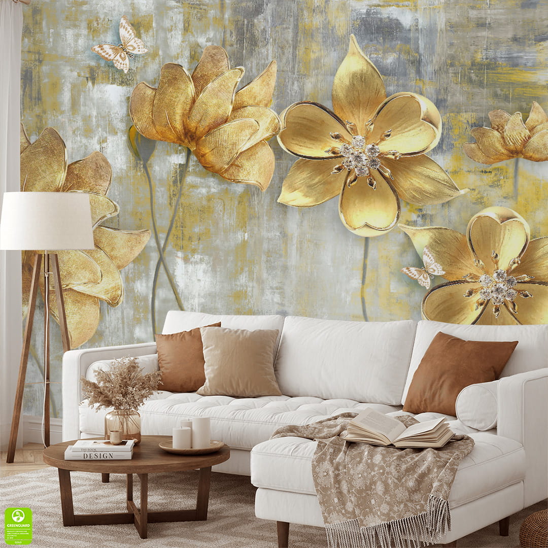 Do jakich aranżacji najlepiej pasuje fototapeta z motywem złotych kwiatów?