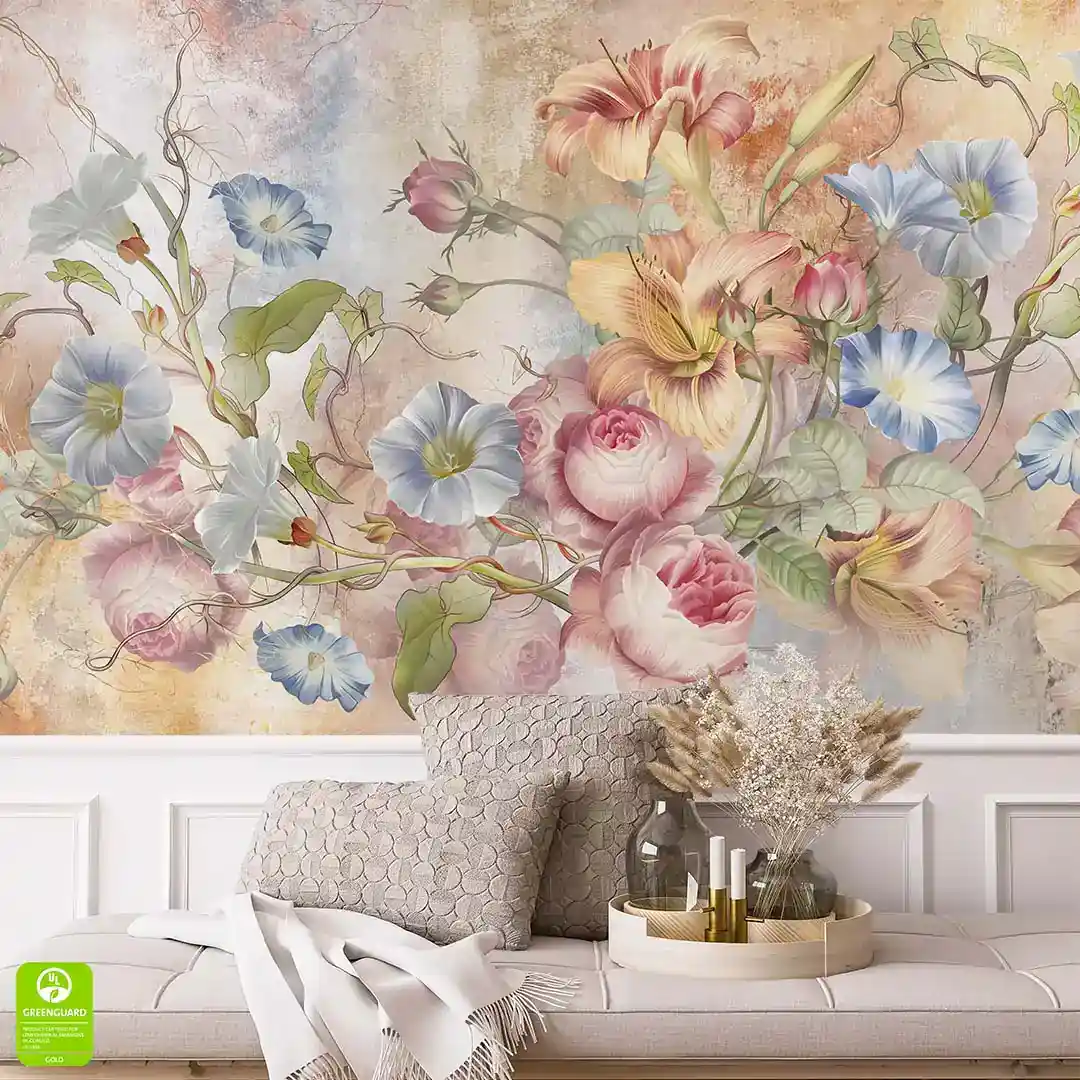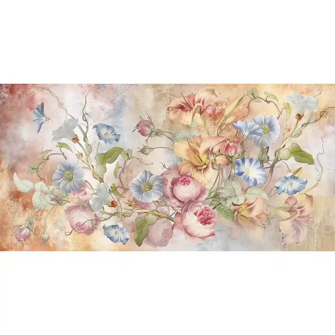 Fototapeta na wymiar: Kolorowe Kwiaty Polne i Róże Akwarelowe – Styl Romantyczny Vintage, Fototapeta do salonu i sypialni, Pastelowy pomarańcz i błękit, Malarski tynk XXL