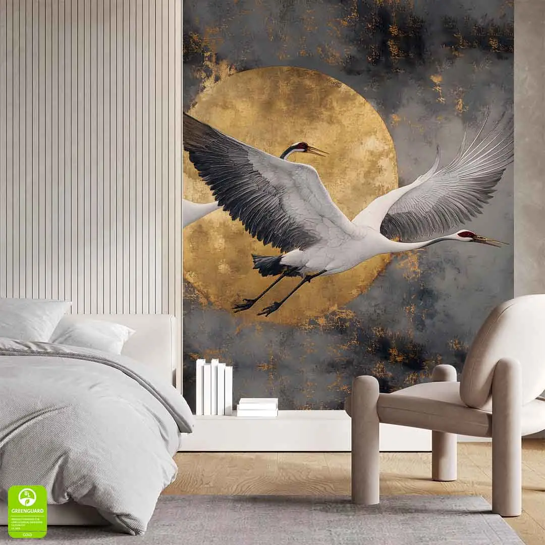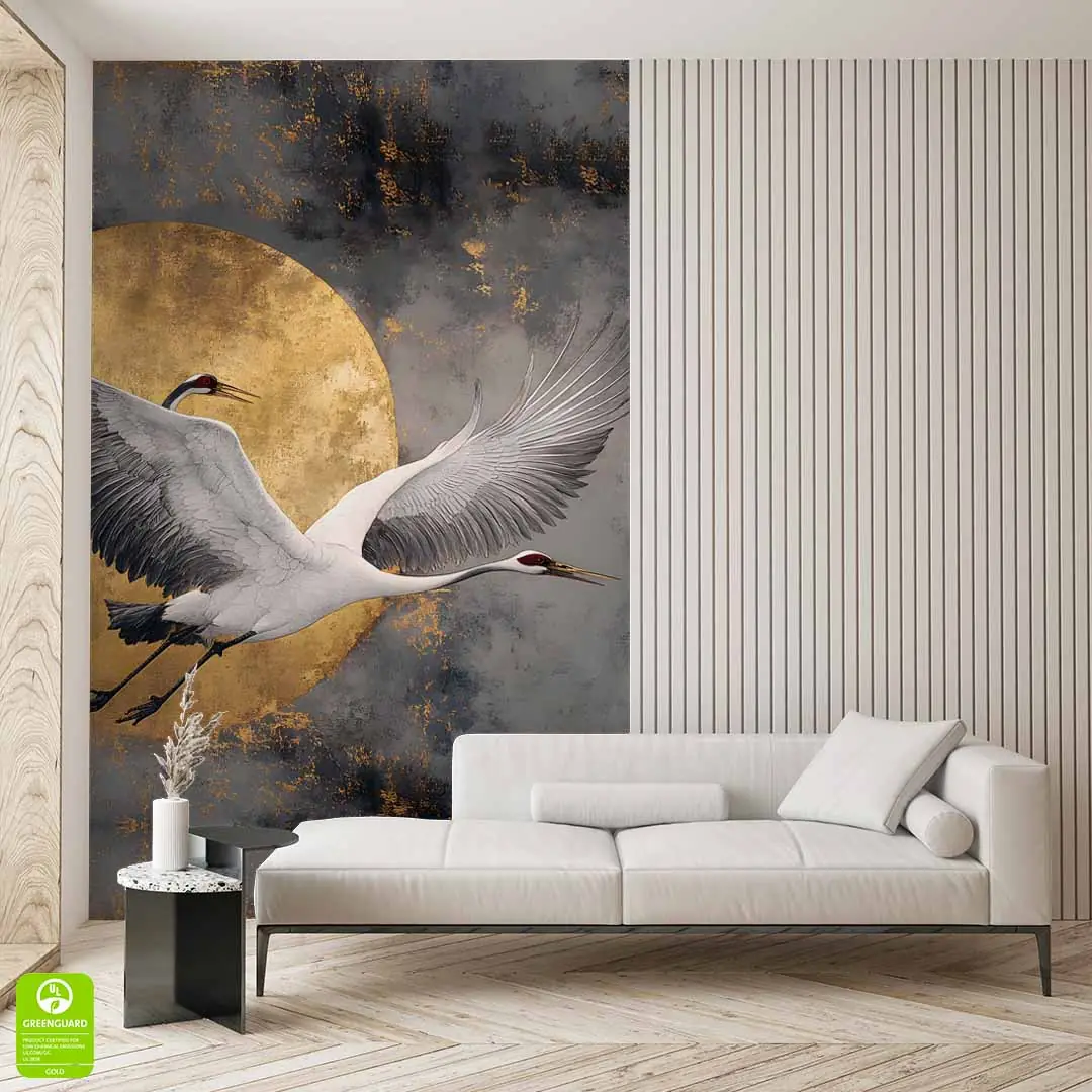 Fototapeta na wymiar żurawie lecące na tle złotego księżyca – elegancka tapeta ścienna do salonu, sypialni