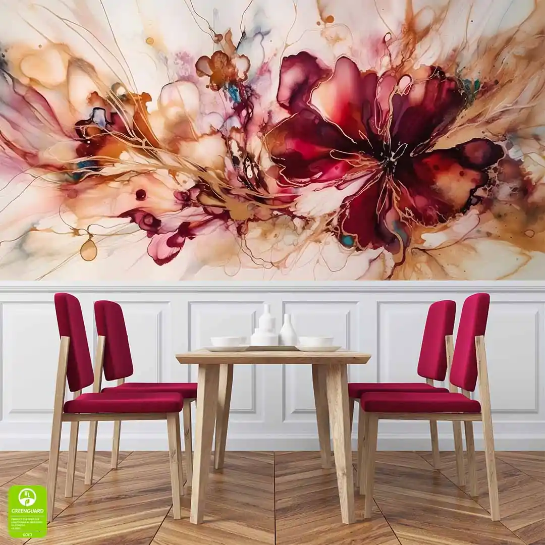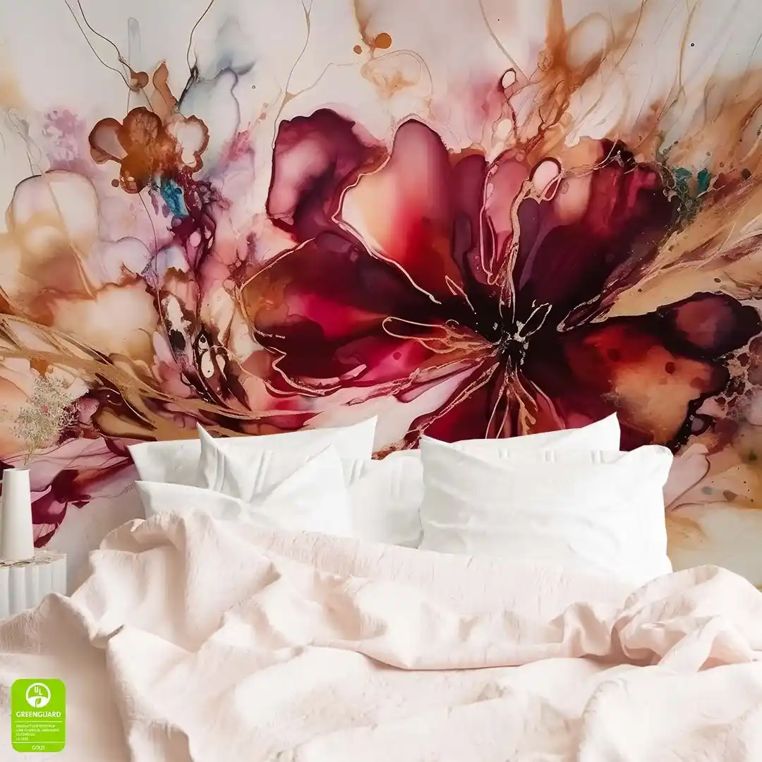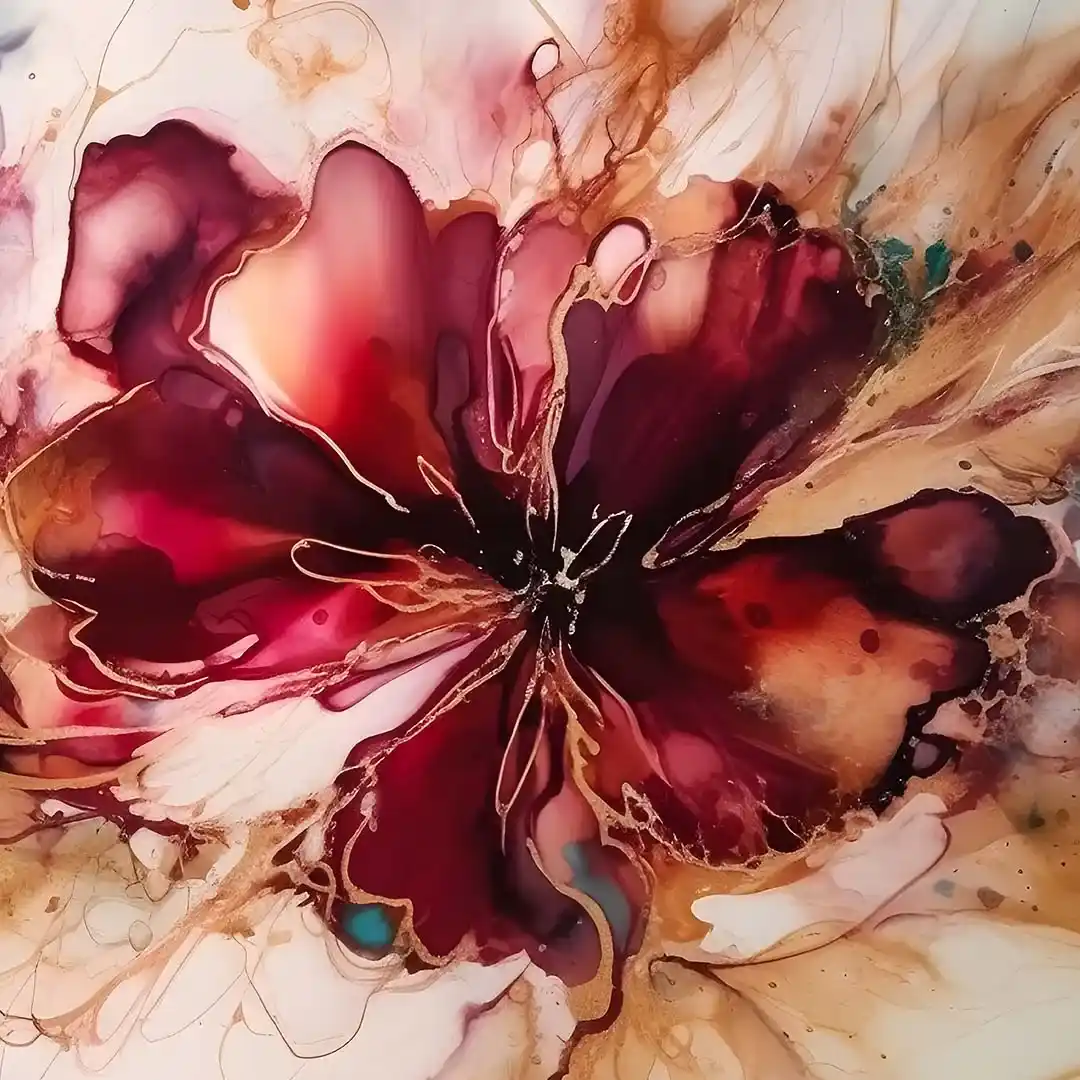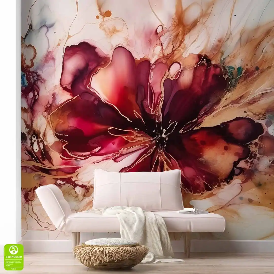 Fototapeta na wymiar: Abstrakcyjny Kwiat Ink – Styl Nowoczesny i Glamour, Elegancki salon i sypialnia, Bordowa i Kolor Złota, Akwarelowa dekoracja XXL