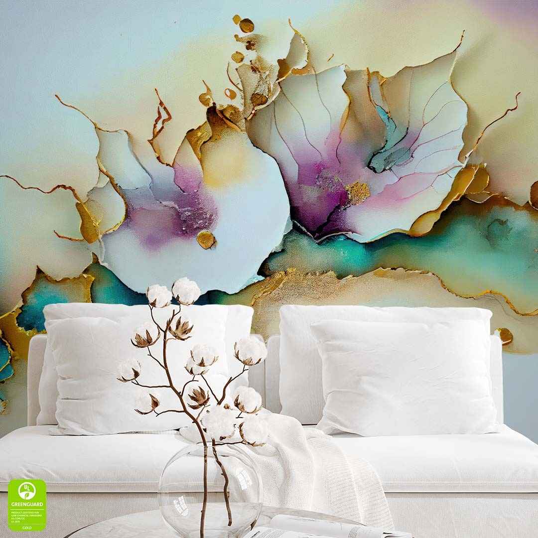 Fototapeta - Abstrakcja kwiaty 3D do sypialni na wymiar - fioletowa turkusowa kolor złota nowoczesna, styl glamour i nowoczesny