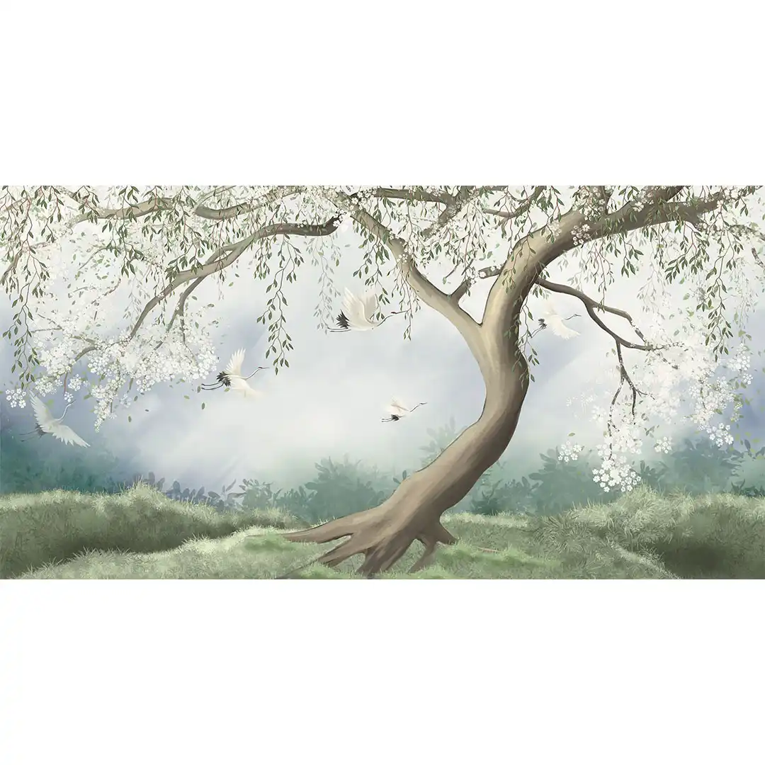 Fototapeta - Kwitnące duże drzewo żurawie do sypialni salonu na wymiar - biel zieleń, styl orientalny skandynawski boho