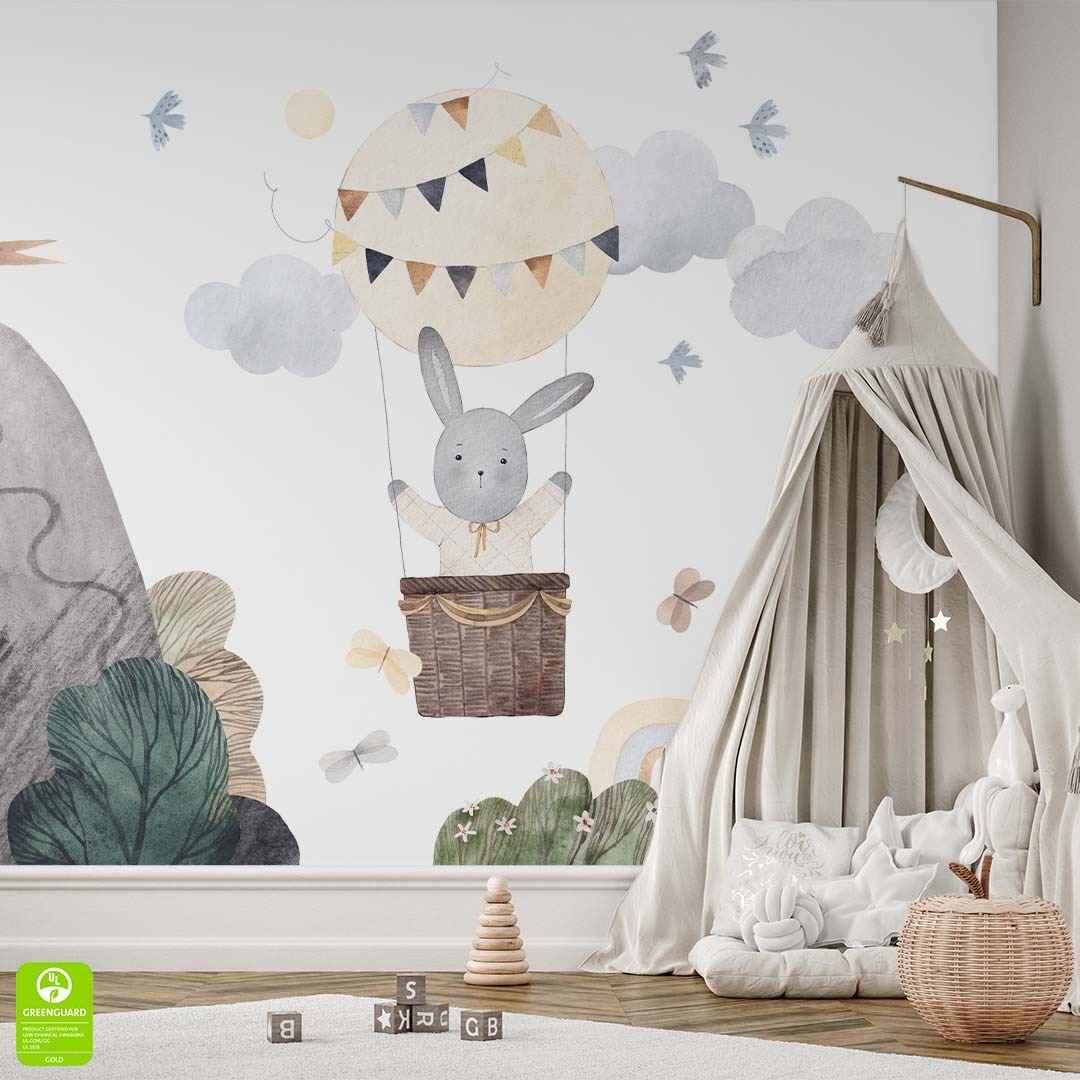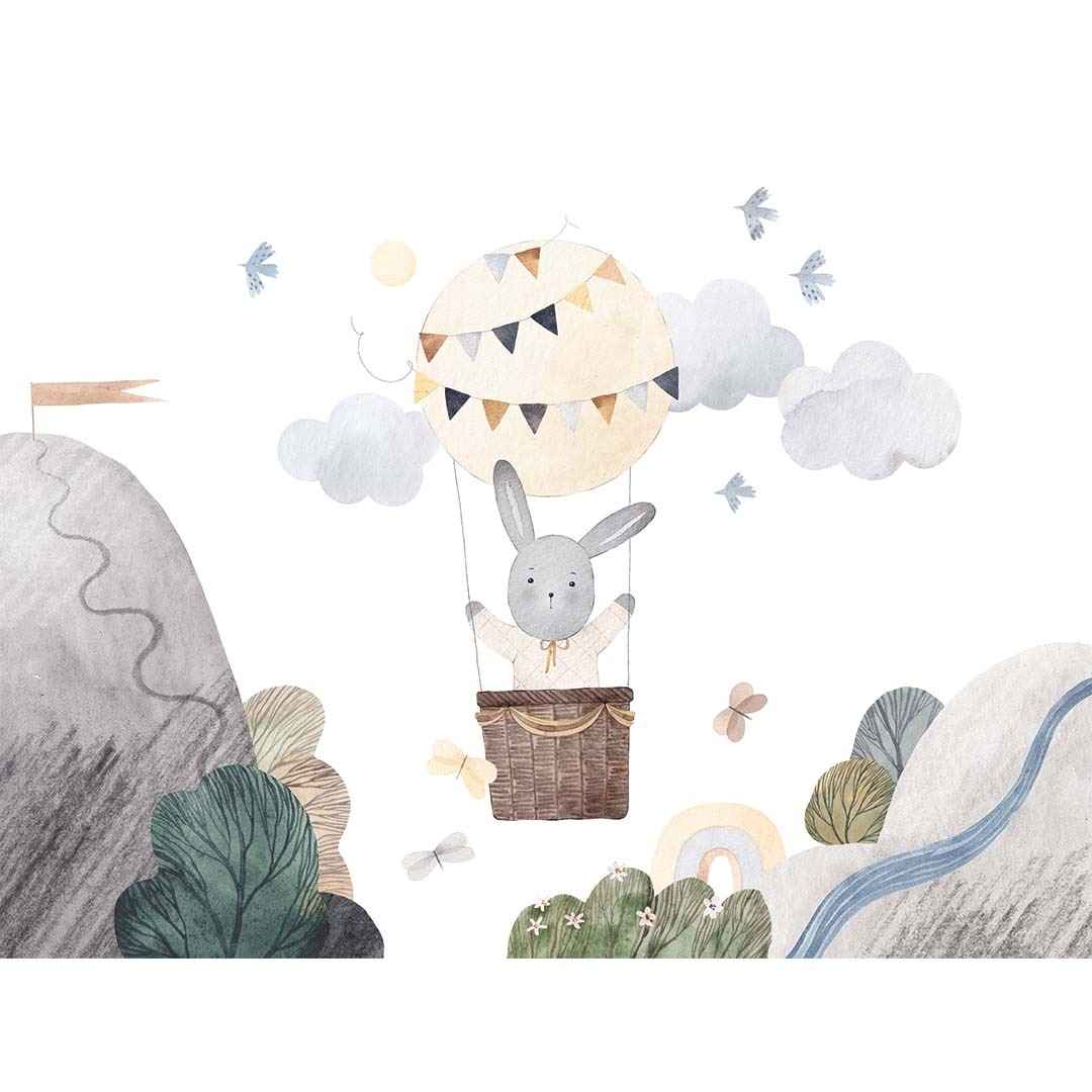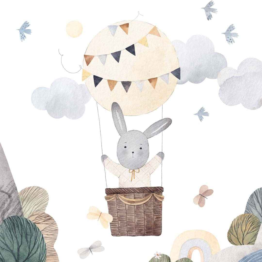 Fototapeta na wymiar: Zając w Balonie, Tęcza i Chmury – Styl Skandynawski i Boho, Pokój dziecka i sypialnia malucha, Pastelowa Beżowo-Błękitna, Akwarelowa dekoracja XXL
