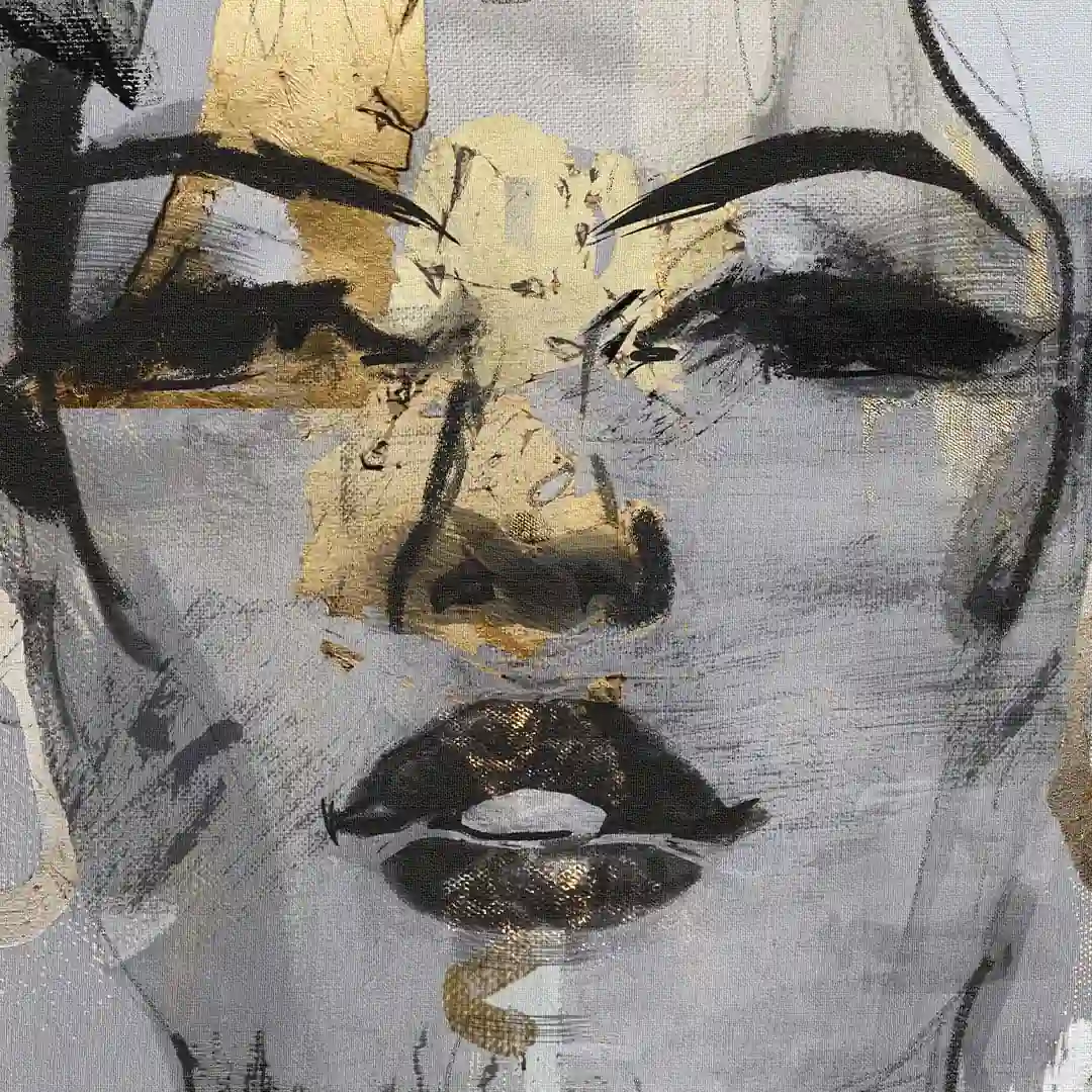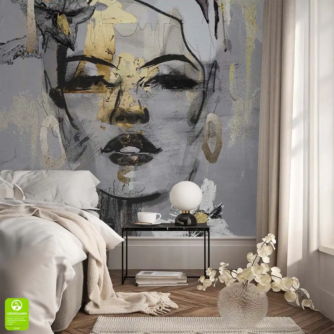 Fototapeta twarz kobiety na wymiar – szara z kolorem złota, nowoczesna sypialnia i salon, styl glamour i nowoczesny