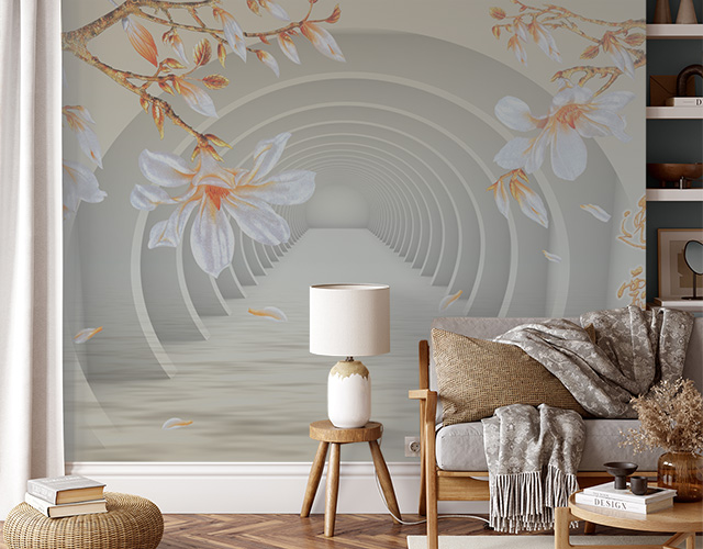 🔍 Fototapeta "Przestrzenny biały tunel za motywem z kwiatów"