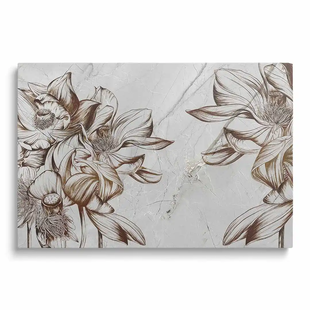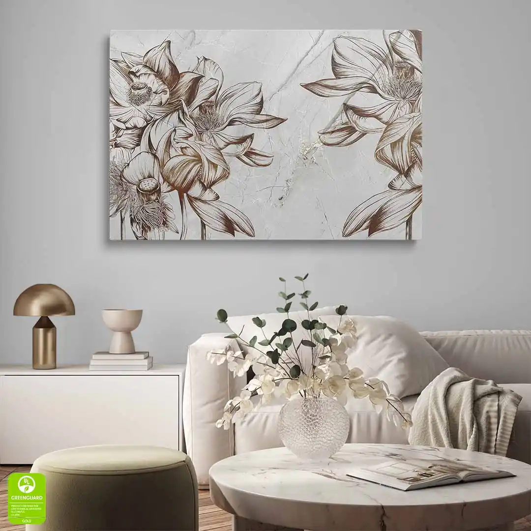 - techniką druku - proces drukowania wykorzystuje inne metody tworzenia kolorów (tzw. "przestrzeń barw") niż te, które stosowane są na ekranach komputera; kolory drukowane mogą wyglądać również nieco inaczej na różnych materiałach (np. canvasie, flizelinie, papierze czy szkle itp.) i przy użyciu różnych tuszy, w naszym przypadku tuszy do druku UV; złote elementy nie są wybiórczo metalizowane - efekt uzyskany jest poprzez wydruk tekstury w kolorze złota;
