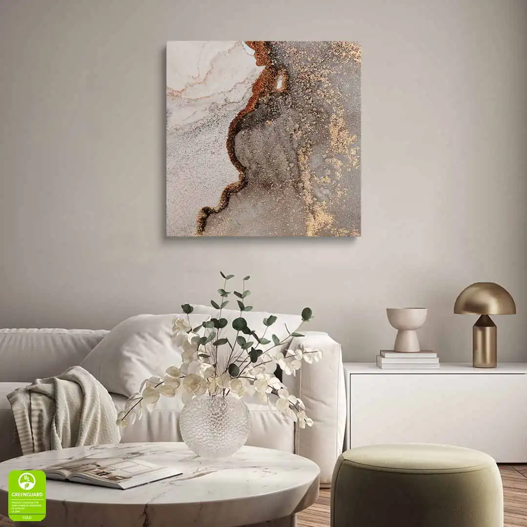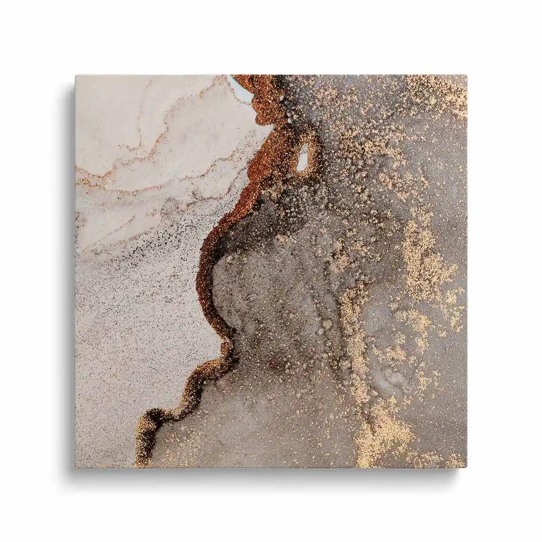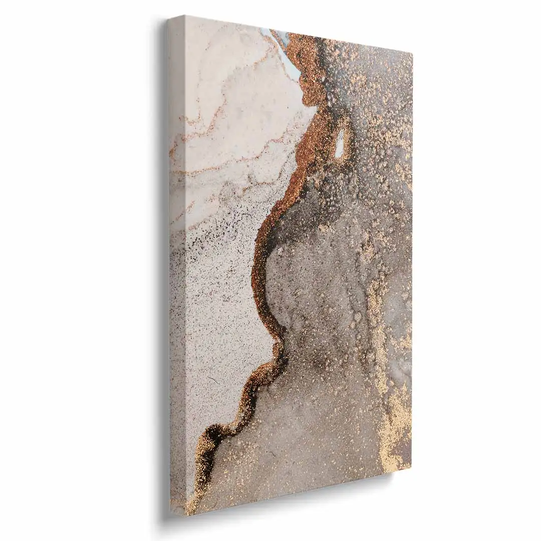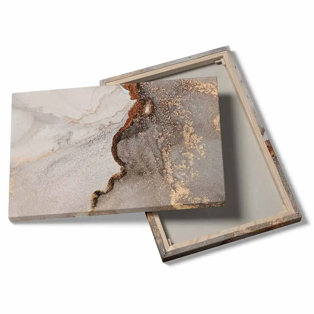 - techniką druku - proces drukowania wykorzystuje inne metody tworzenia kolorów (tzw. "przestrzeń barw") niż te, które stosowane są na ekranach komputera; kolory drukowane mogą wyglądać również nieco inaczej na różnych materiałach (np. canvasie, flizelinie, papierze czy szkle itp.) i przy użyciu różnych tuszy, w naszym przypadku tuszy do druku UV; złote elementy nie są wybiórczo metalizowane - efekt uzyskany jest poprzez wydruk tekstury w kolorze złota;