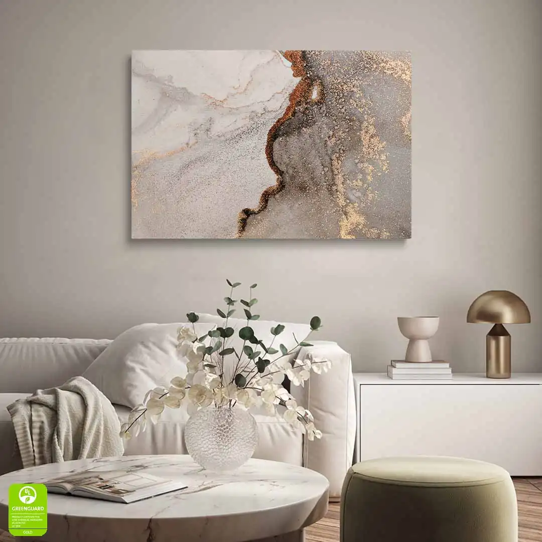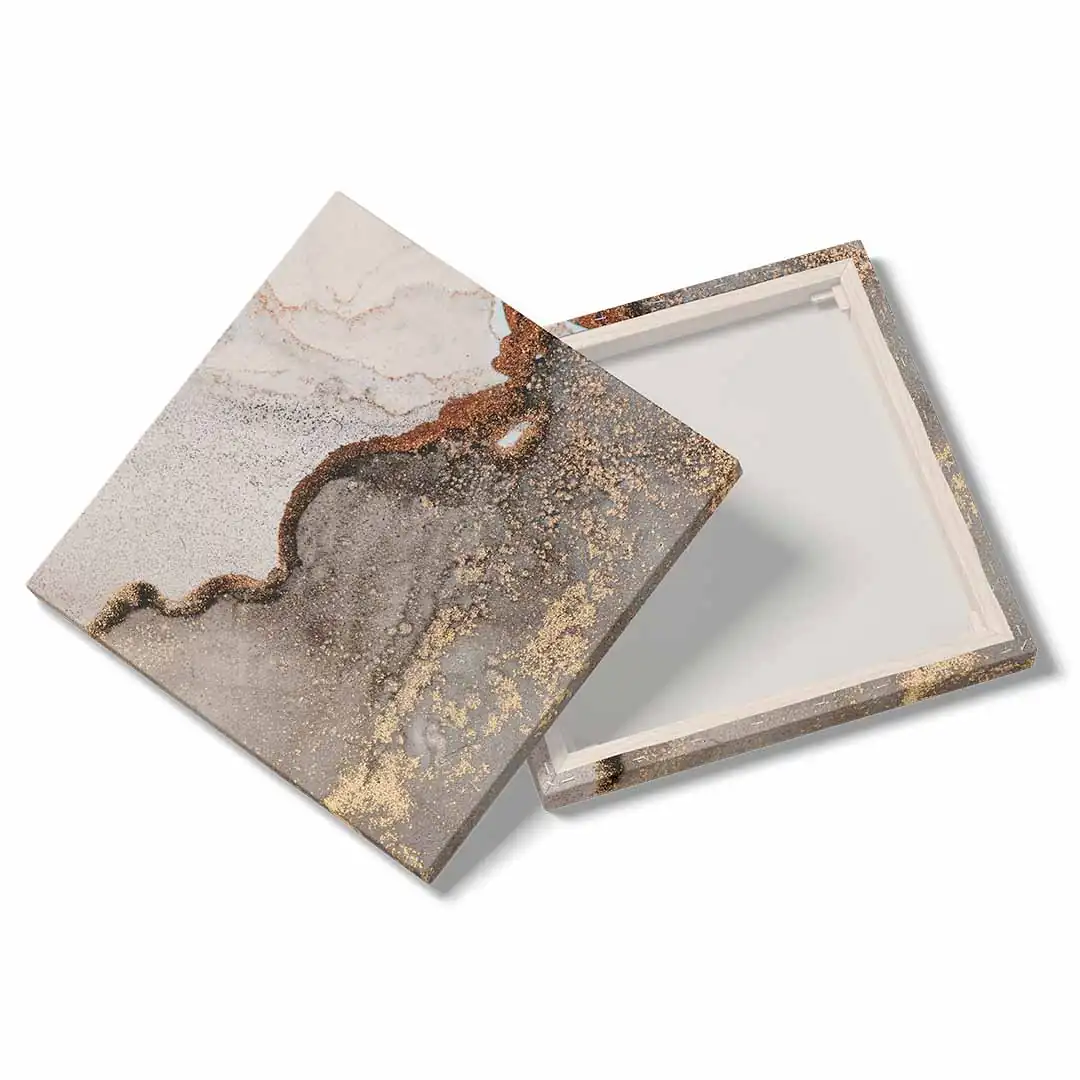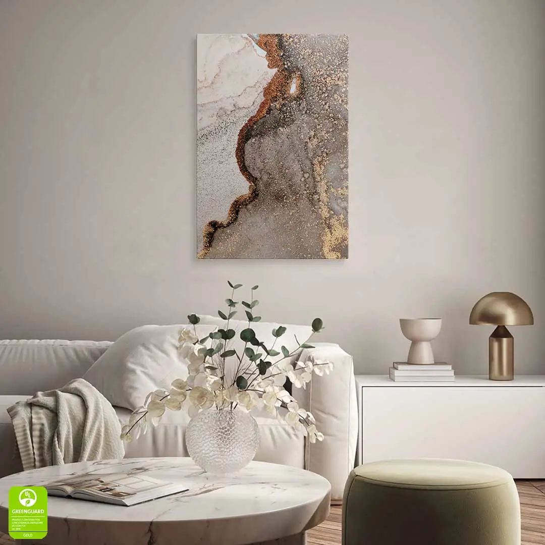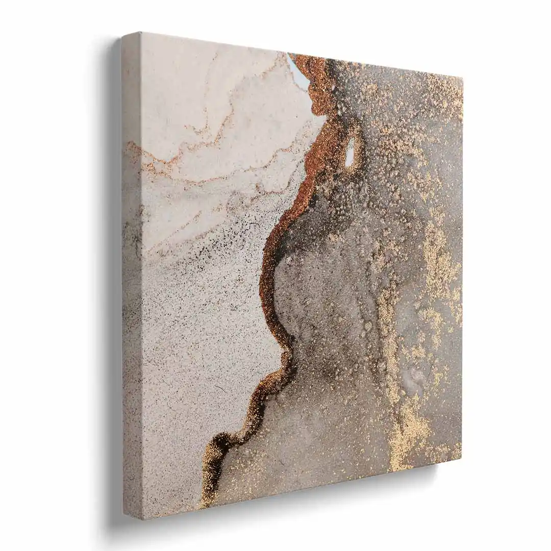 - techniką druku - proces drukowania wykorzystuje inne metody tworzenia kolorów (tzw. "przestrzeń barw") niż te, które stosowane są na ekranach komputera; kolory drukowane mogą wyglądać również nieco inaczej na różnych materiałach (np. canvasie, flizelinie, papierze czy szkle itp.) i przy użyciu różnych tuszy, w naszym przypadku tuszy do druku UV; złote elementy nie są wybiórczo metalizowane - efekt uzyskany jest poprzez wydruk tekstury w kolorze złota;