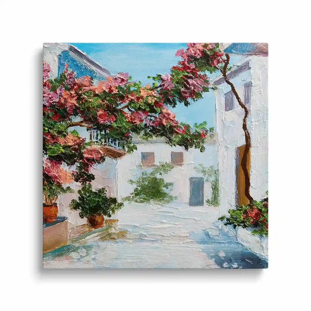 Obraz na płótnie Grecki zaułek to idealna propozycja dla miłośników spokojnych, malowniczych zakątków Grecji. Przedstawia urokliwą uliczkę, w której czas zwalnia, a jasne kolory i charakterystyczna architektura tworzą niepowtarzalną atmosferę. Ten obraz pozwoli wprowadzić do każdego wnętrza odrobinę śródziemnomorskiego słońca i spokoju.