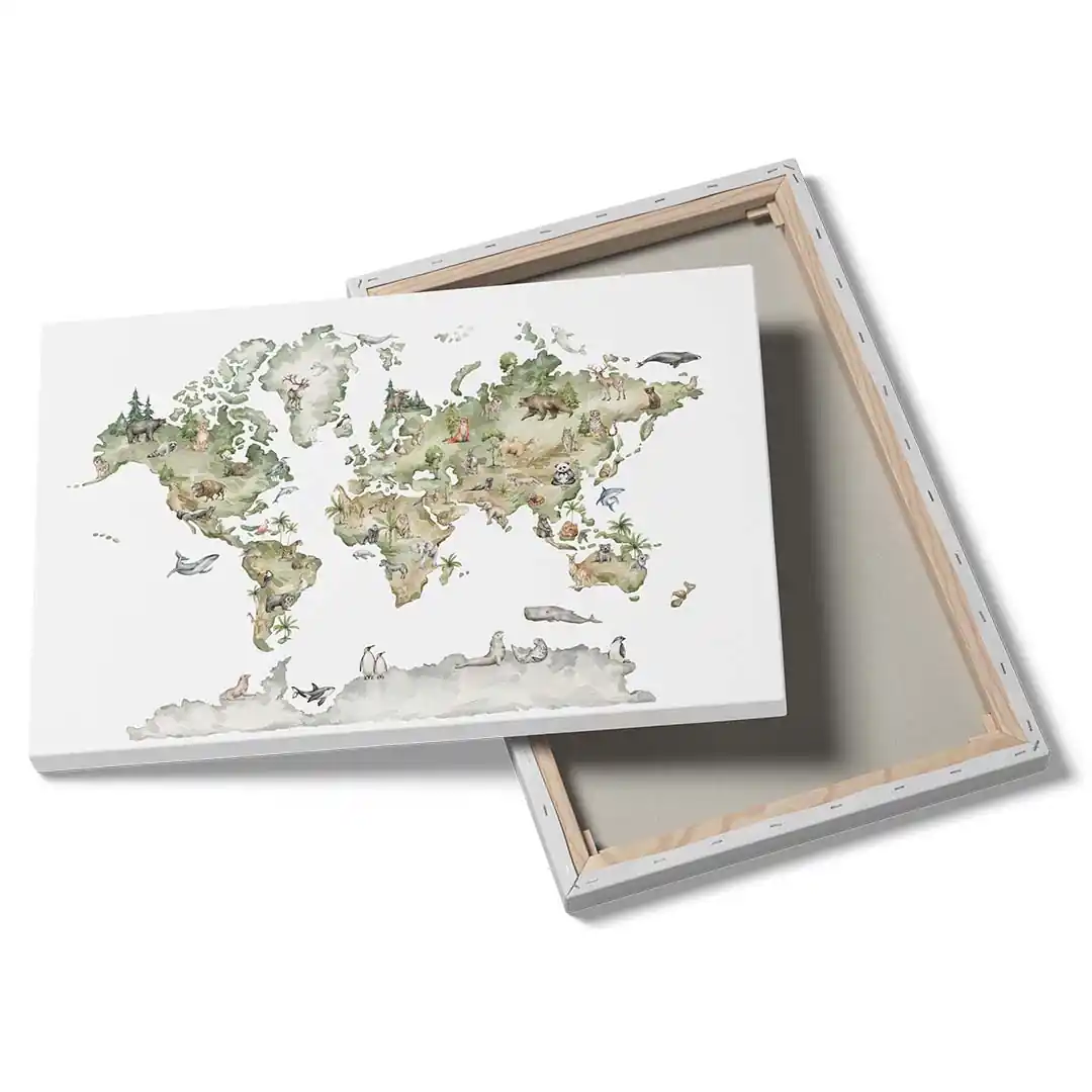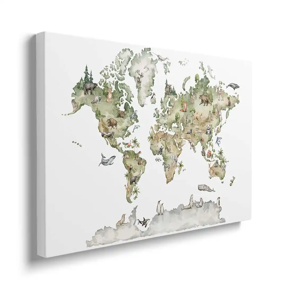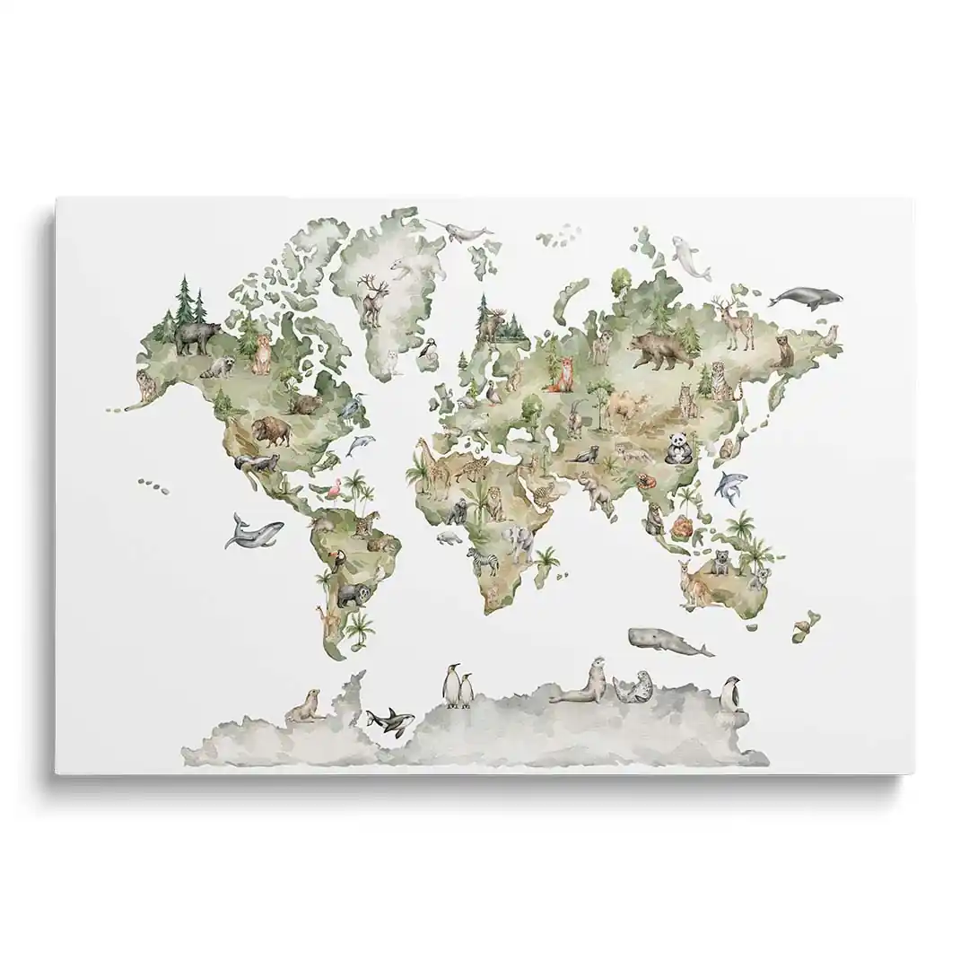 Obraz na płótnie „Mapa świata ze zwierzętami dla dzieci” – Edukacja przez zabawę