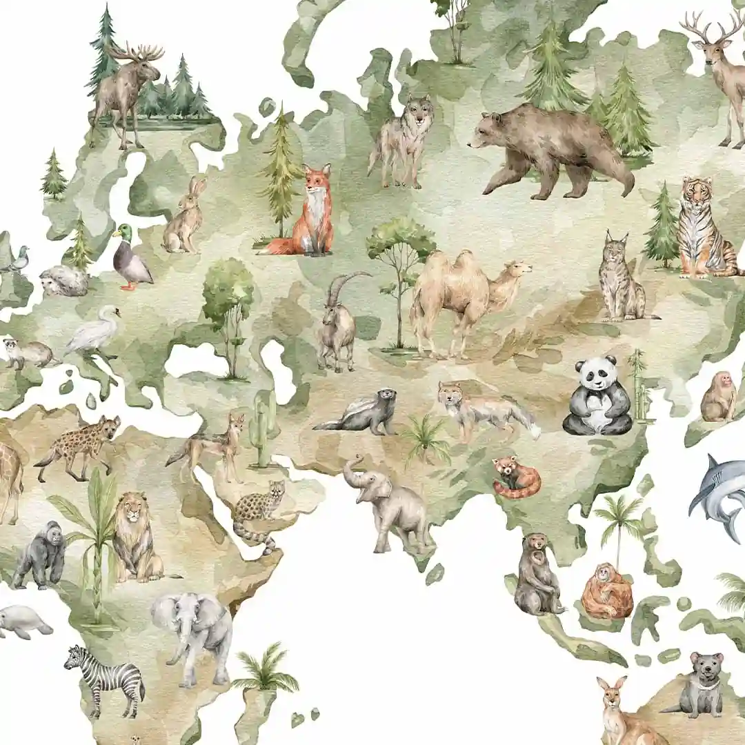 Mapa świata ze zwierzętami – edukacyjna dekoracja do pokoju dziecka