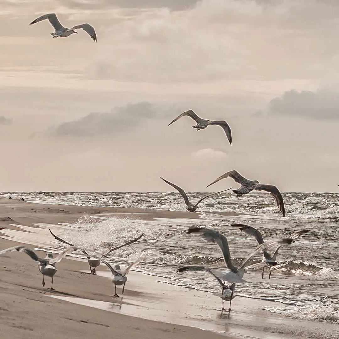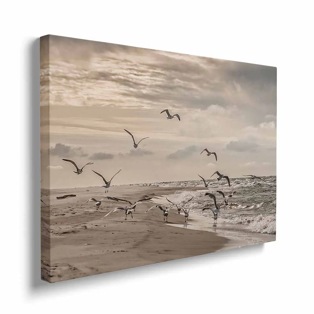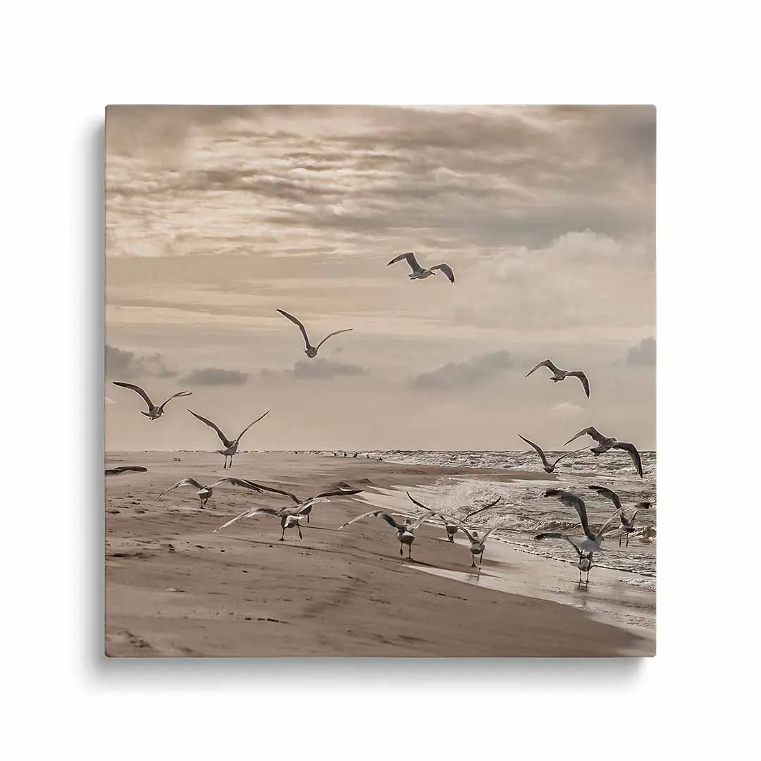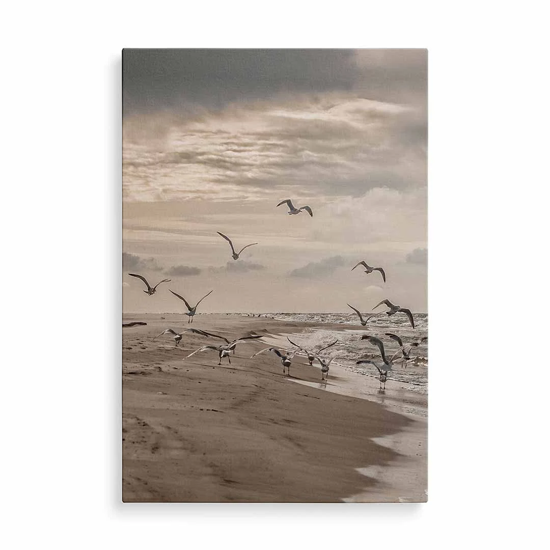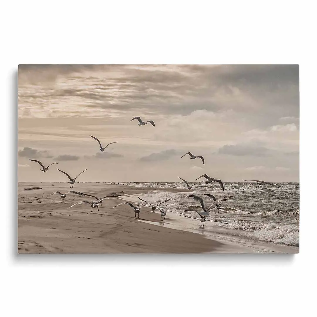 Obraz na płótnie mewy odlatujące z plaży nad Bałtykiem – harmonia i spokój