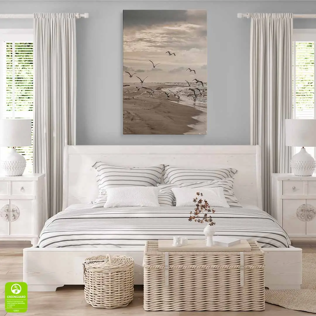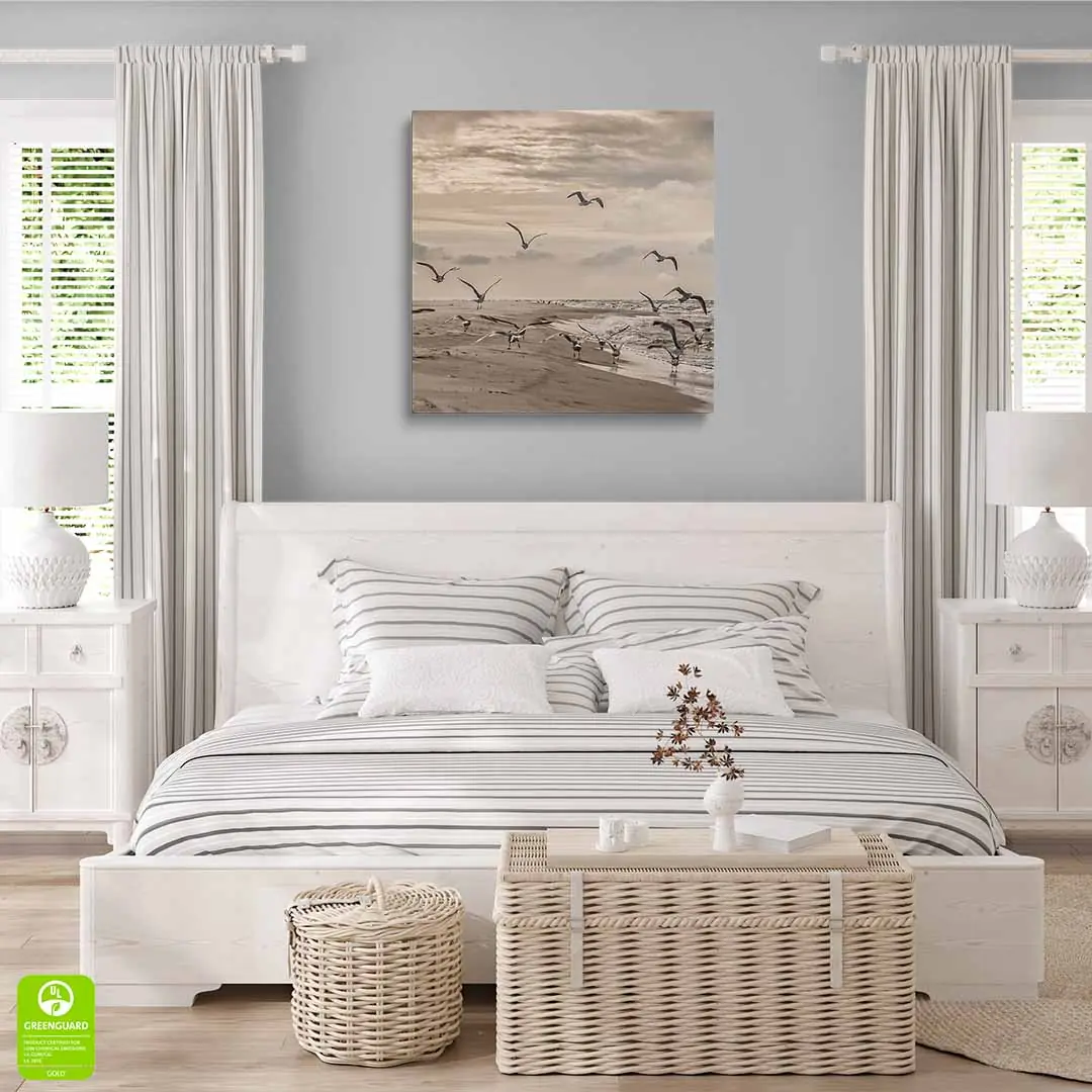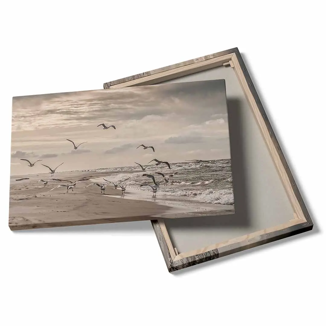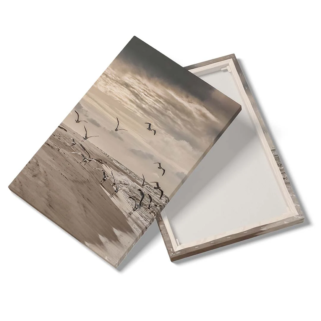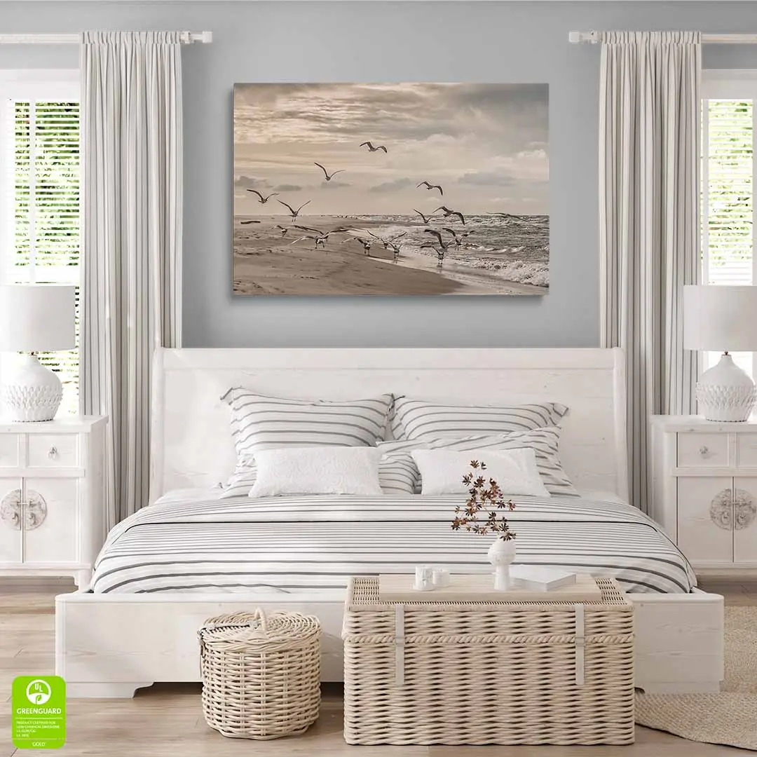 Ten obraz na płótnie doskonale oddaje piękno bałtyckiego wybrzeża. Naturalne barwy, delikatne fale i unoszące się mewy wprowadzają do wnętrza atmosferę relaksu i przestronności. To doskonały wybór dla osób pragnących poczuć morski klimat we własnym domu.