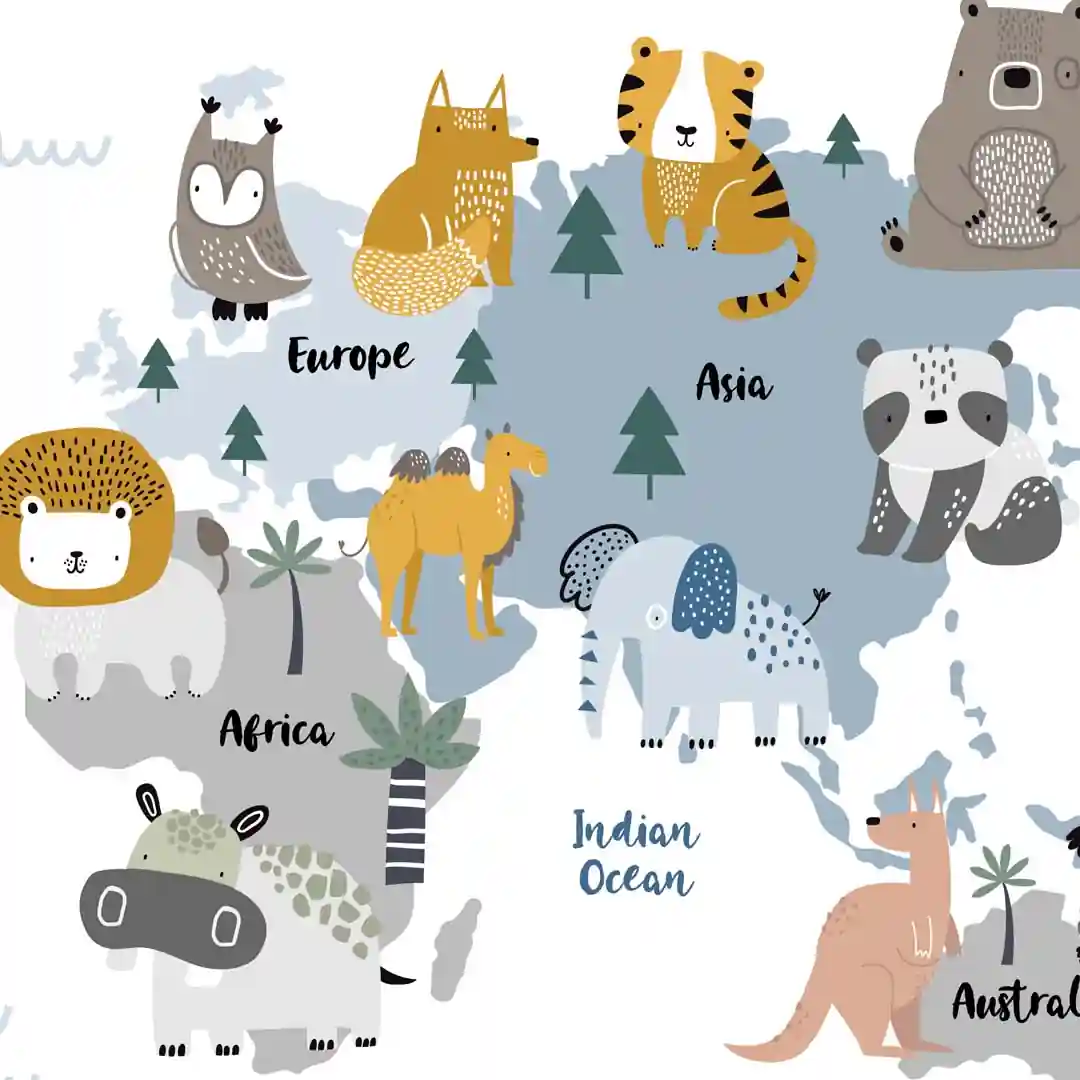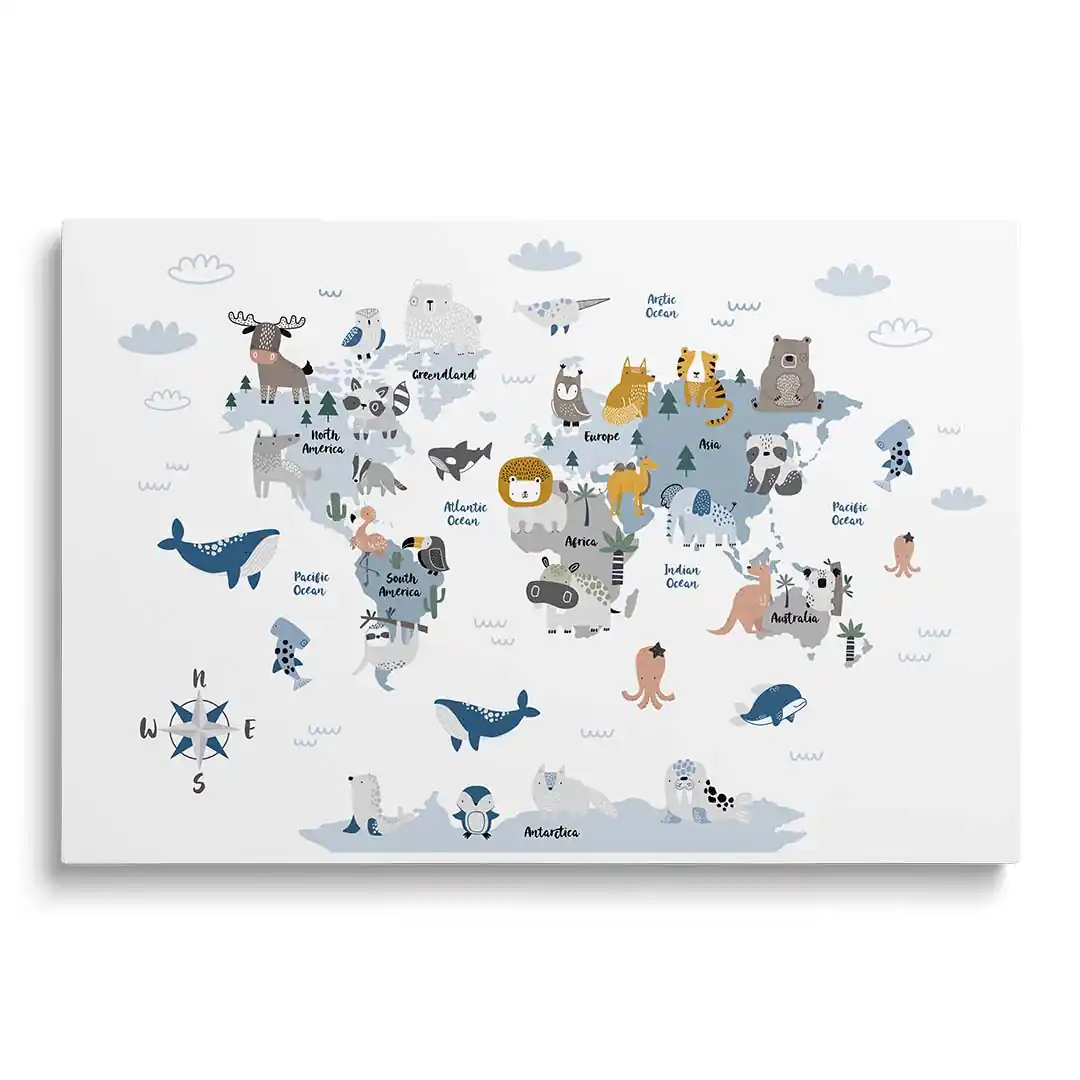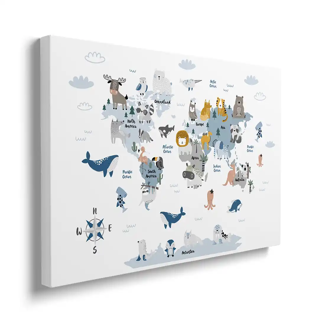 Obraz na płótnie Zwierzątka na mapie świata dla dzieci — nauka przez zabawę