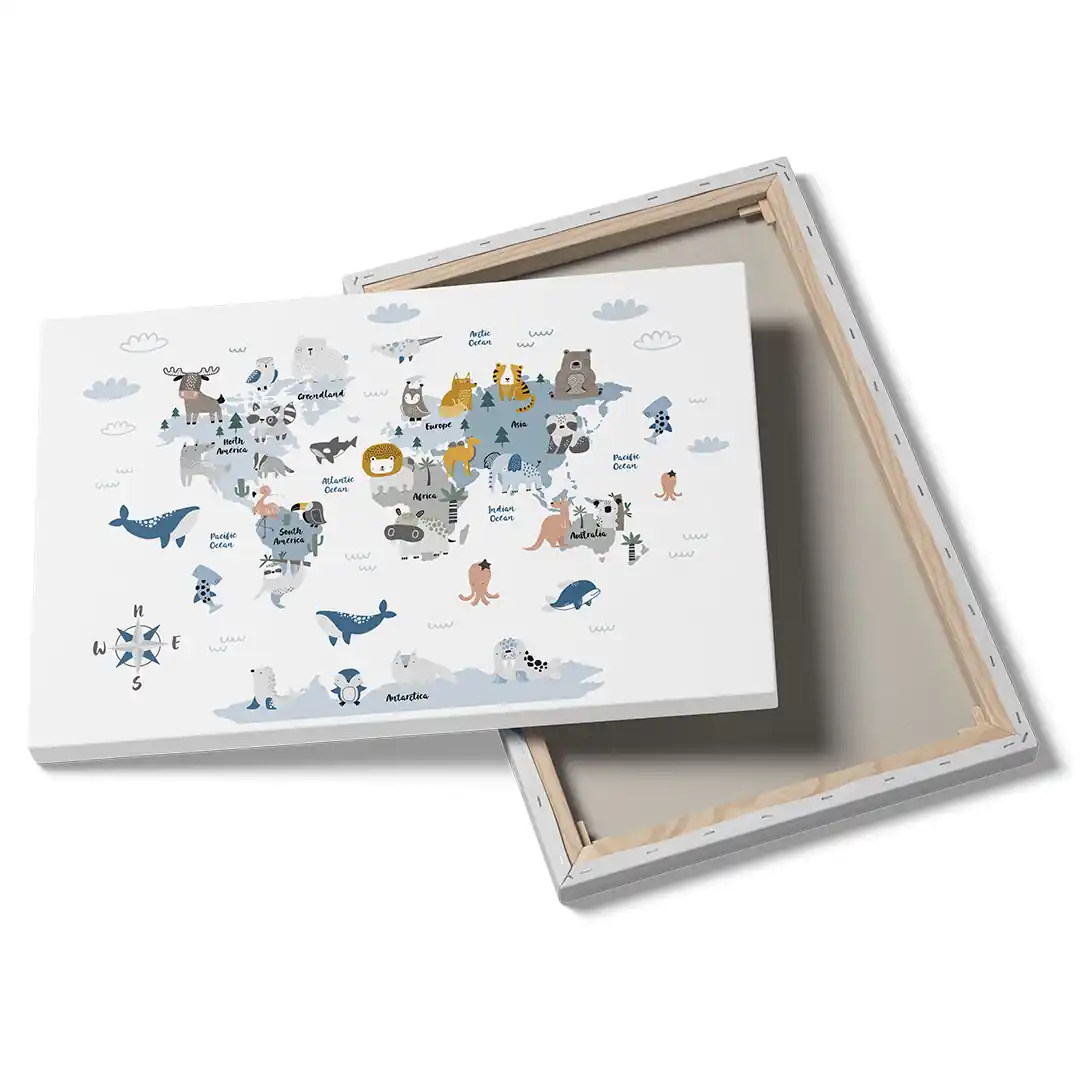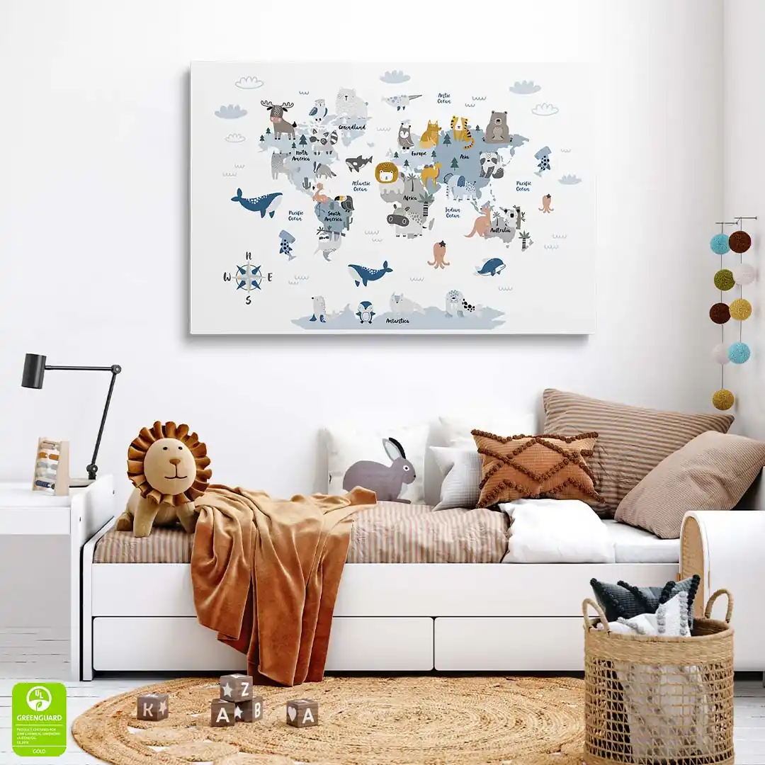 Radosny motyw ze zwierzętami rozmieszczonymi na kontynentach zachęca do odkrywania świata i rozwija ciekawość maluchów. Obraz na płótnie Zwierzątka na mapie świata dla dzieci łączy przyjazną kolorystykę z czytelną kompozycją, dzięki czemu świetnie odnajdzie się nad łóżkiem, biurkiem lub kącikiem do zabawy. Miękkie przejścia barw i matowa faktura płótna wprowadzają ciepło i przytulność do pokoju dziecka.