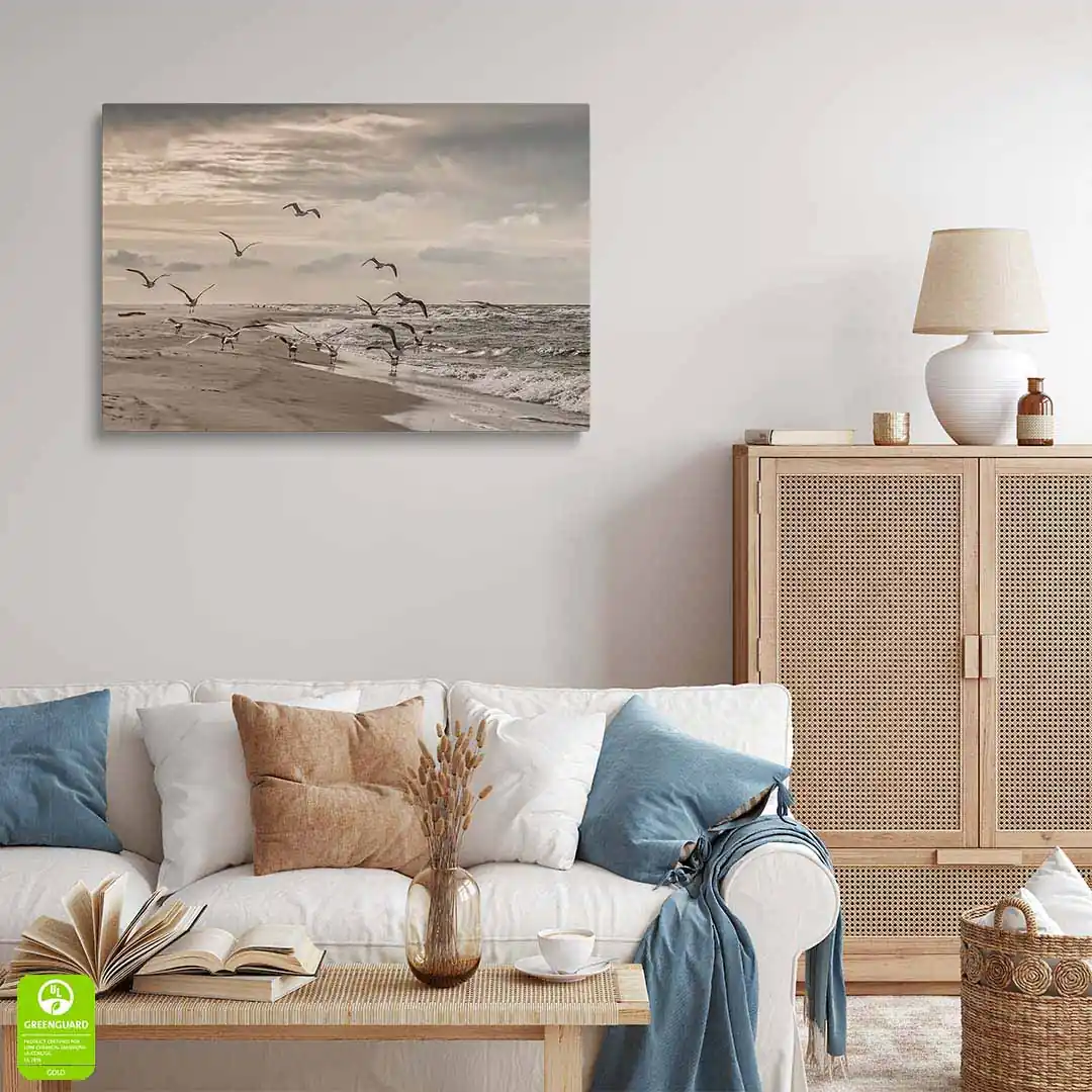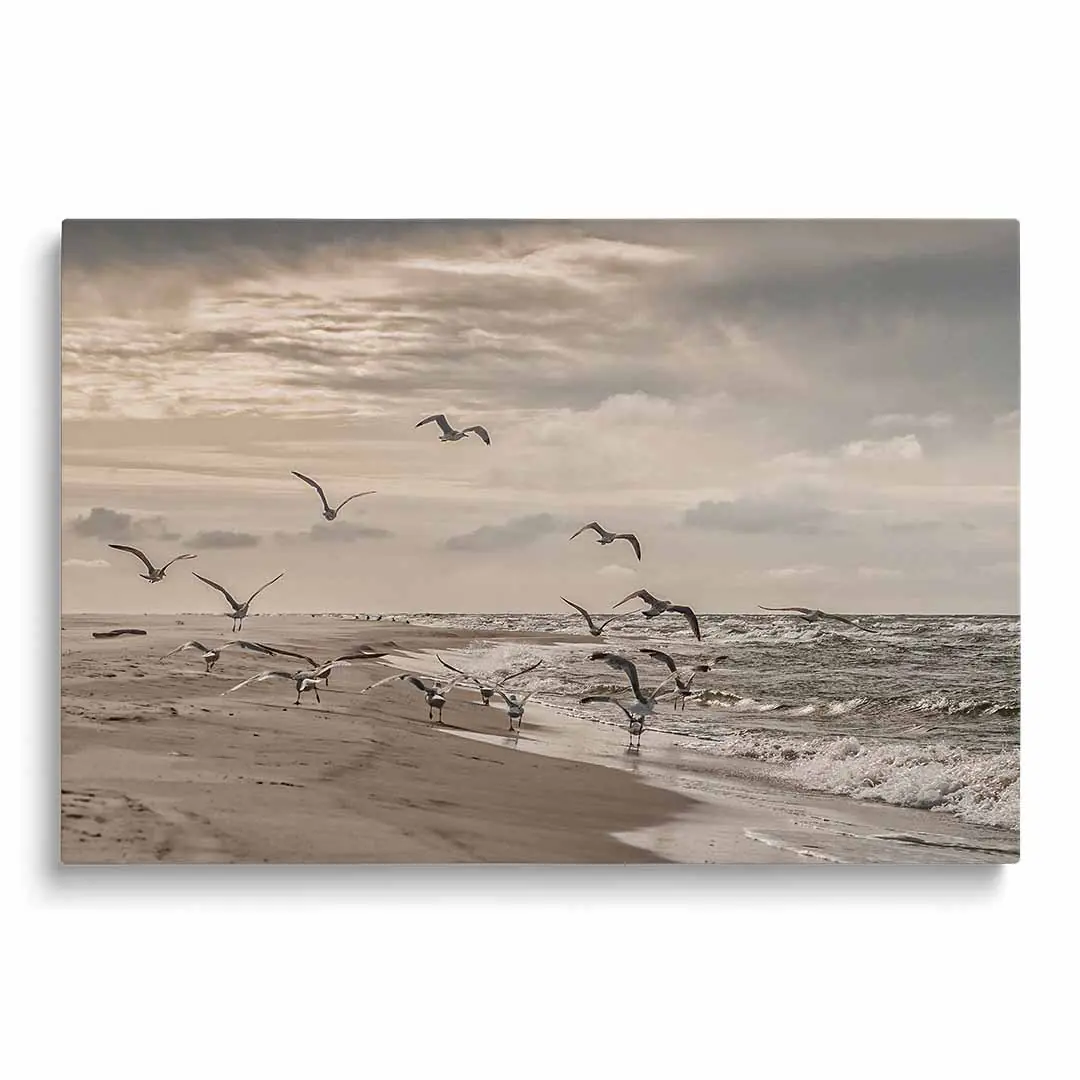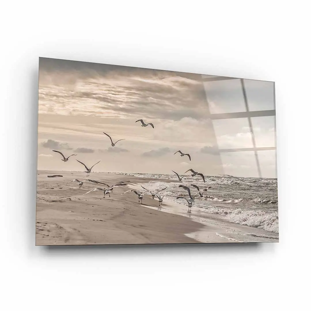 Obraz na szkle akrylowym - Mewy odlatujące z plaży nad Bałtykiem - Nadmorski krajobraz