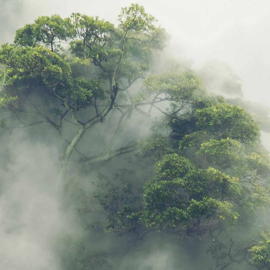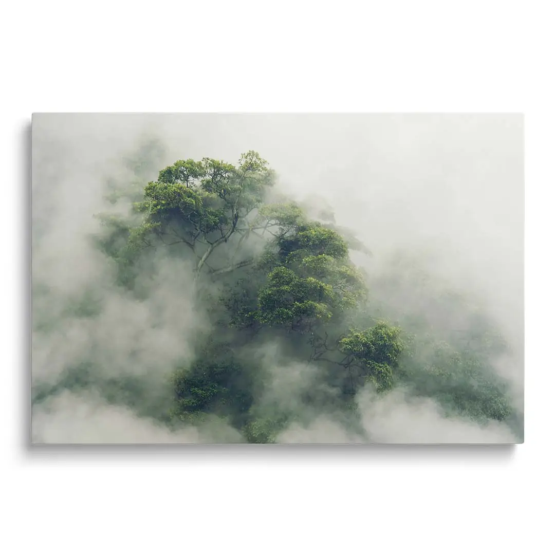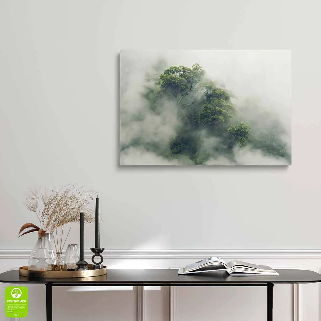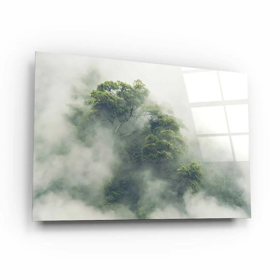 Obraz na szkle akrylowym „Zamglone korony drzew” – nowoczesna dekoracja ścienna do salonu, biura lub sypialni w stylu skandynawskim