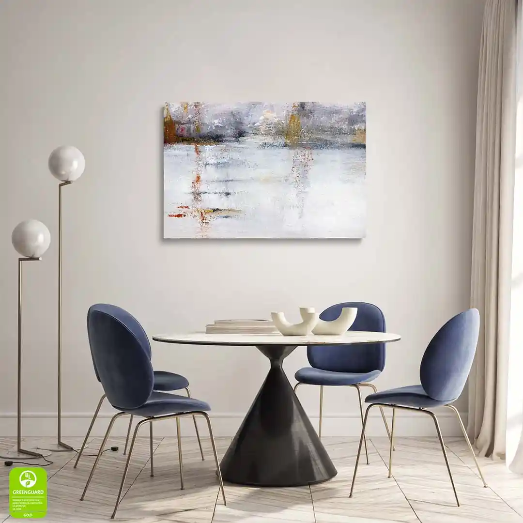 - techniką druku - proces drukowania wykorzystuje inne metody tworzenia kolorów (tzw. "przestrzeń barw") niż te, które stosowane są na ekranach komputera; kolory drukowane mogą wyglądać również nieco inaczej na różnych materiałach (np. canvasie, flizelinie, papierze czy szkle itp.) i przy użyciu różnych tuszy, w naszym przypadku tuszy do druku UV; złote elementy nie są wybiórczo metalizowane - efekt uzyskany jest poprzez wydruk tekstury w kolorze złota;