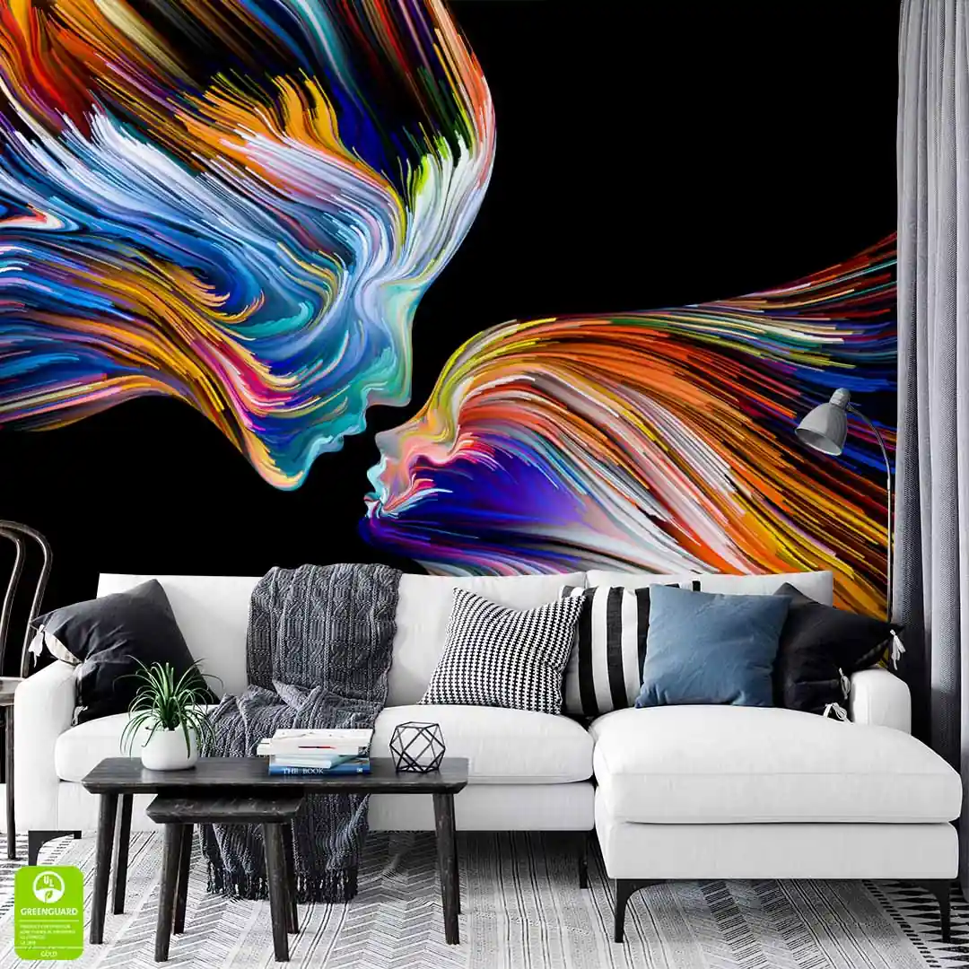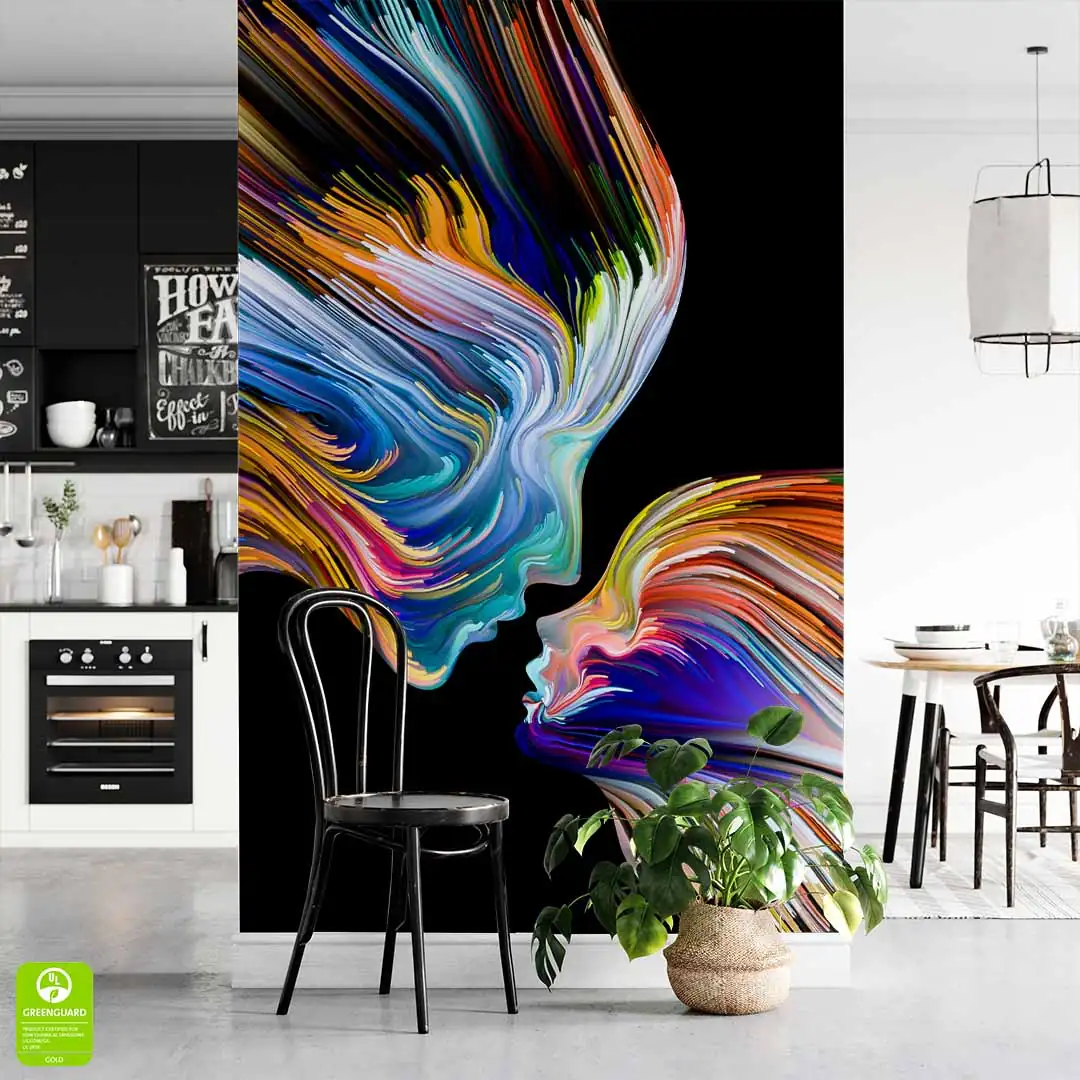 Bliski pocałunek dwóch twarzy - abstrakcyjna fototapeta line-art na wymiar w intensywnych kolorach do sypialni