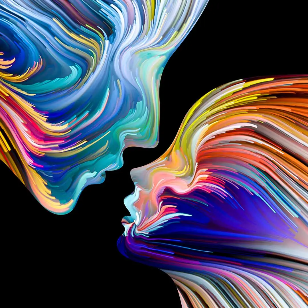 Fototapeta - Bliski pocałunek to niecodzienna propozycja do nowoczesnego wnętrza. Czarne tło tej fototapety pięknie podkreśla wielość barw dwóch twarzy uchwyconych w chwili tuż przed pocałunkiem. Twarze stworzone są z bardzo wielu kolorowych wstęg "świetlnych". Barwy są intensywne, mocno podkreślone. Można tutaj dostrzec kolor żółty, pomarańczowy, czerwony, niebieski, zielony i wiele innych. Jeśli szukasz wyrazistego wzoru, przykuwającego uwagę we wnętrzu, ten wzór na pewno to zapewni. Wielobarwność samego motywu tonuje nieco ciemne tło, które też pięknie eksponuje zarysy twarzy. Sam motyw jest niezwykle klimatyczny, podkreślający bliskość dwojga ludzi. Z tego względu niezwykle ciekawie może prezentować się w sypialni. Motyw doskonale sprawdzi się we wnętrzach urządzanych w stylu nowoczesnym, minimalistycznym czy też loftowym.