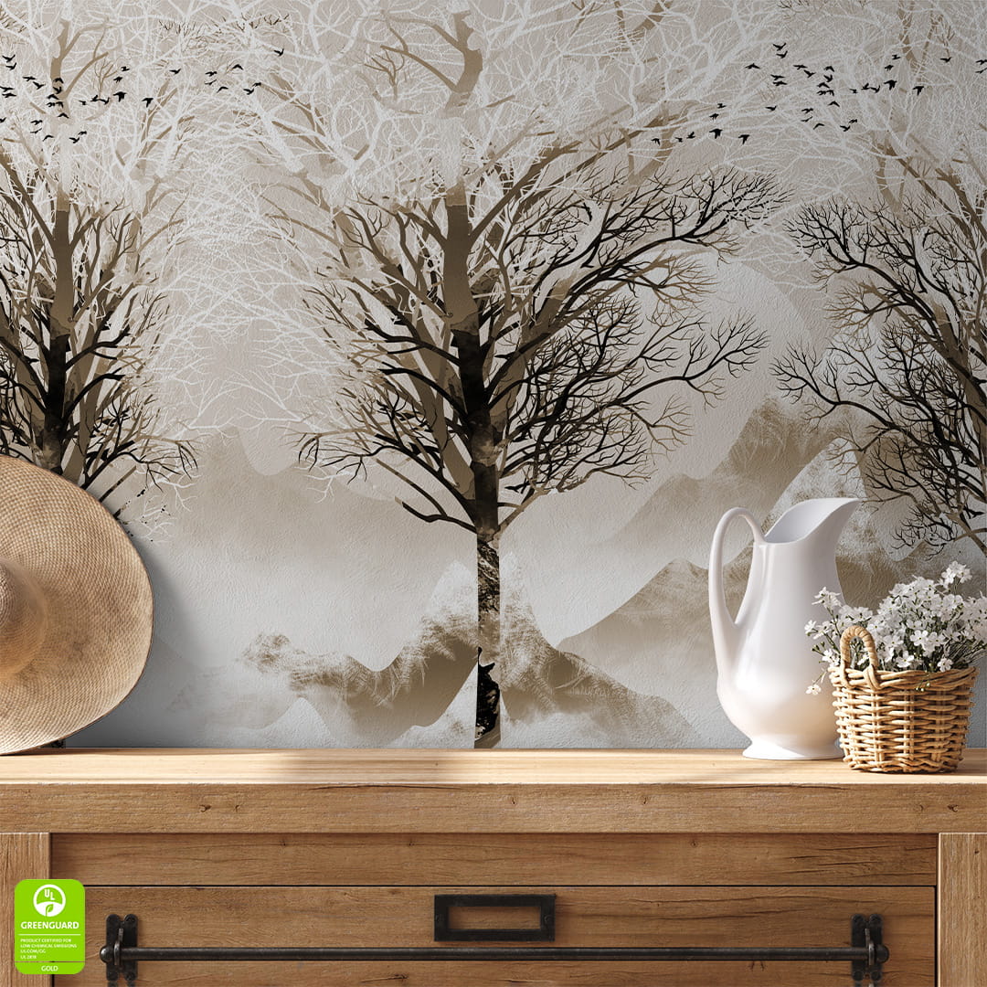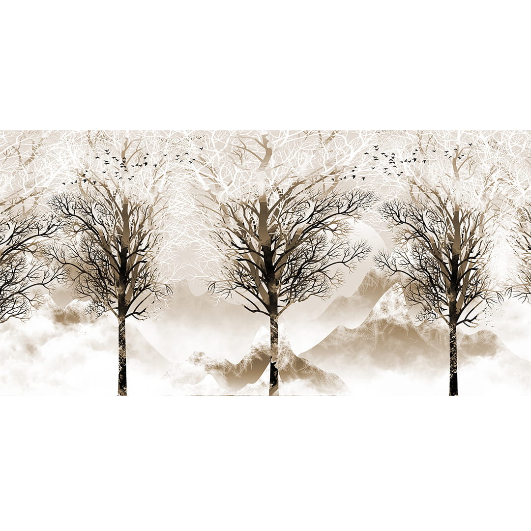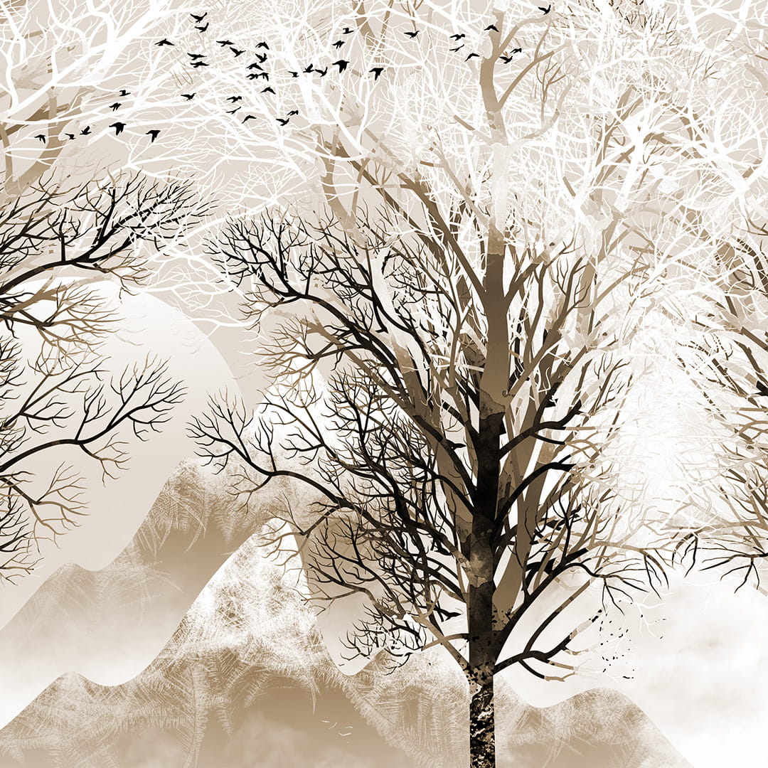 Fototapeta - Brązowy las ptaki góry do salonu sypialni - nowoczesna beżowa na wymiar, styl boho skandynawski
