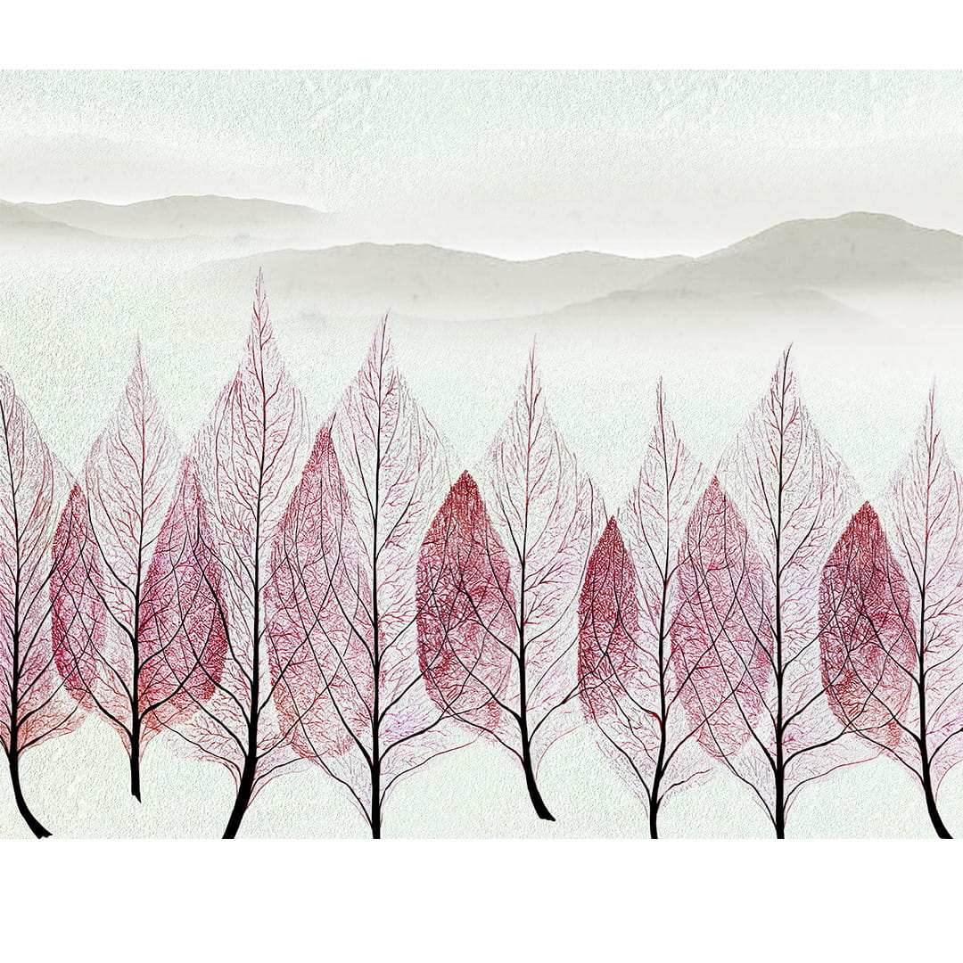 Fototapeta - Pastelowe liście drzewa styl nowoczesny boho sypialnia salon na wymiar - różowa, bordowa panorama
