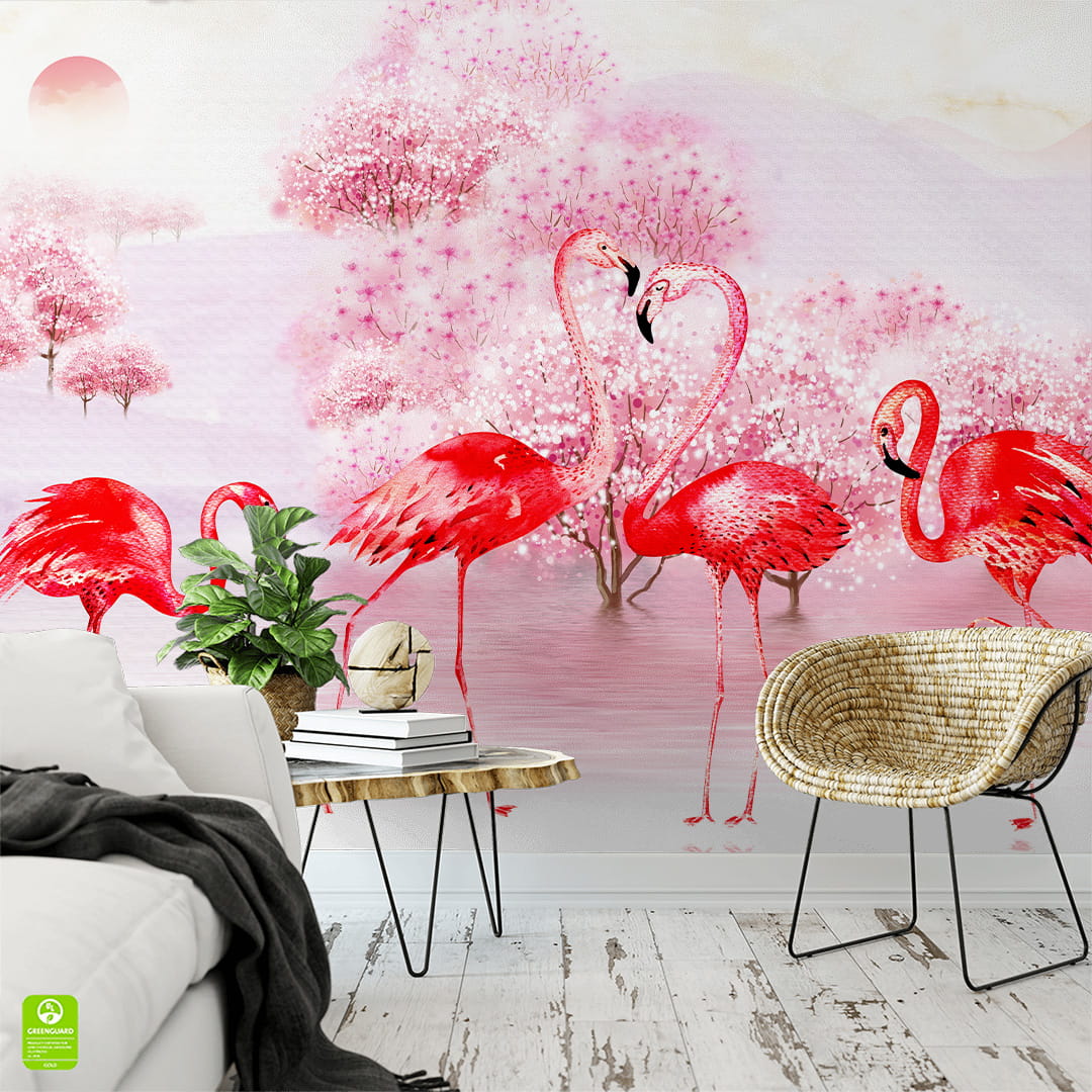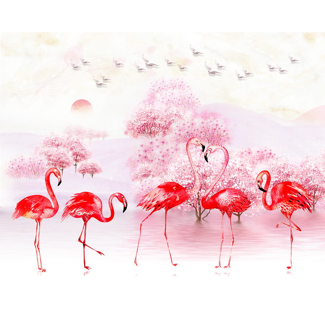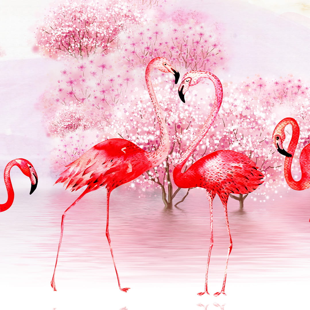 Designerska fototapeta na ścianę "Różowy krajobraz z pięknymi flamingi na pierwszym planie"