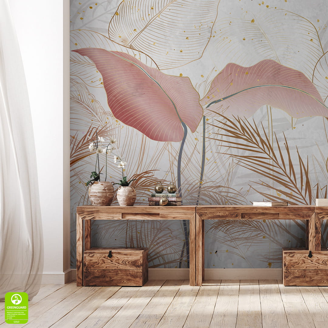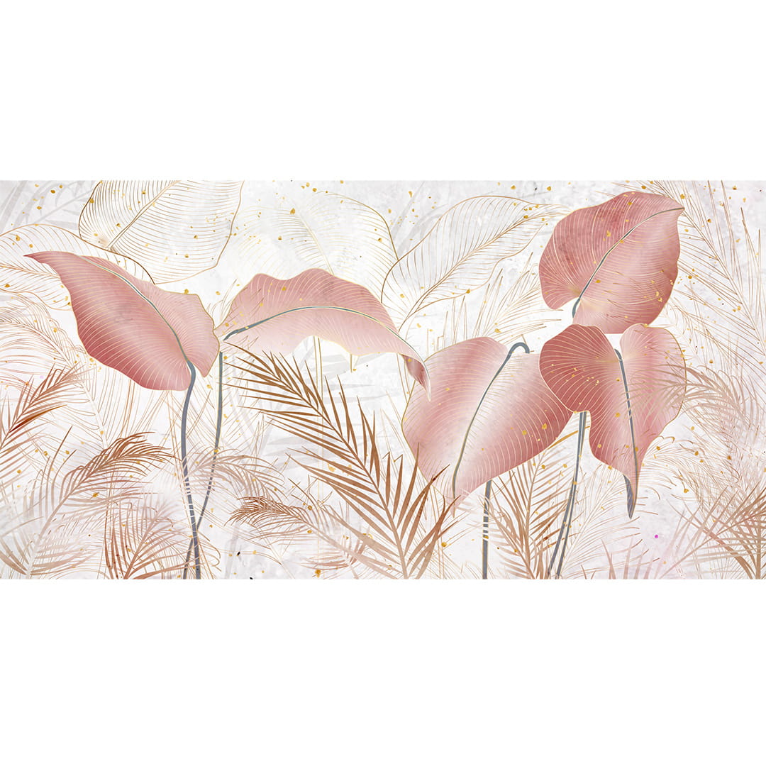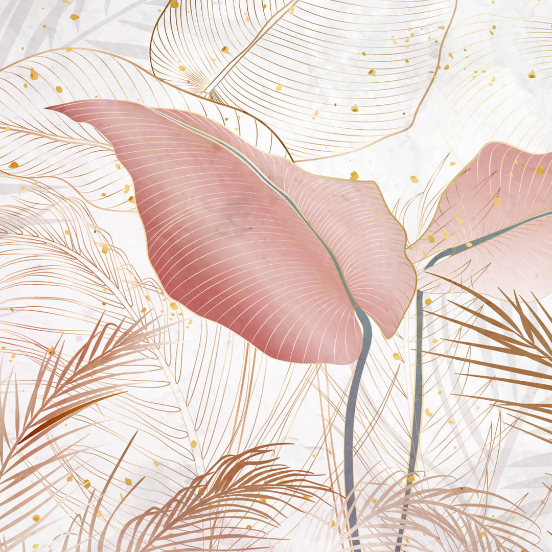 Fototapeta - Różowe liście palmy do sypialni salonu na wymiar, jasna sypialnia, kontury w kolorze złota na jasnym, lekko teksturowanym tle, styl boho glamour