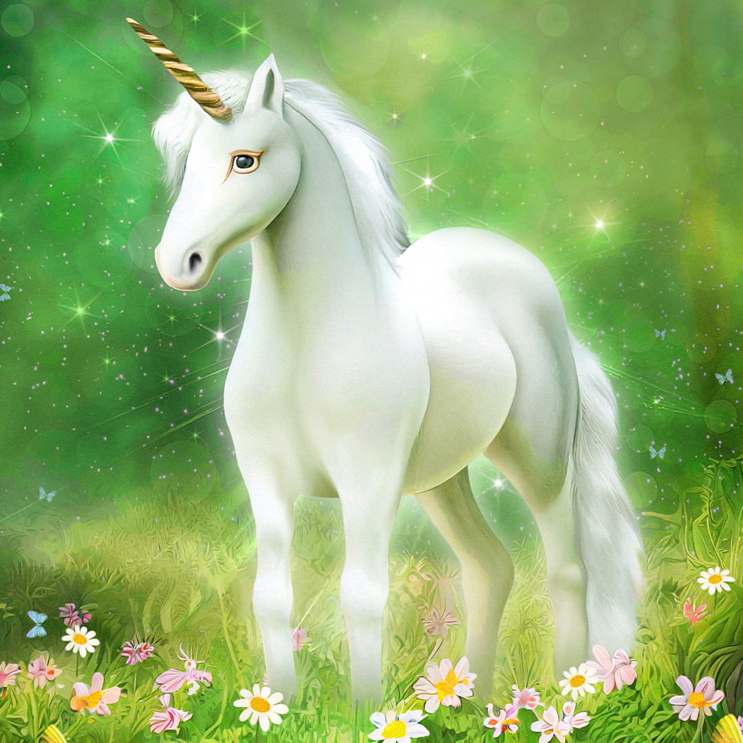 Fototapeta dla dzieci na wymiar - Bajeczna Polana z Jednorożcem – Biały jednorożec na kwietnej łące, świetlisty mural do pokoju dziewczynki, magiczna dekoracja ścienna pełna blasku i motyli