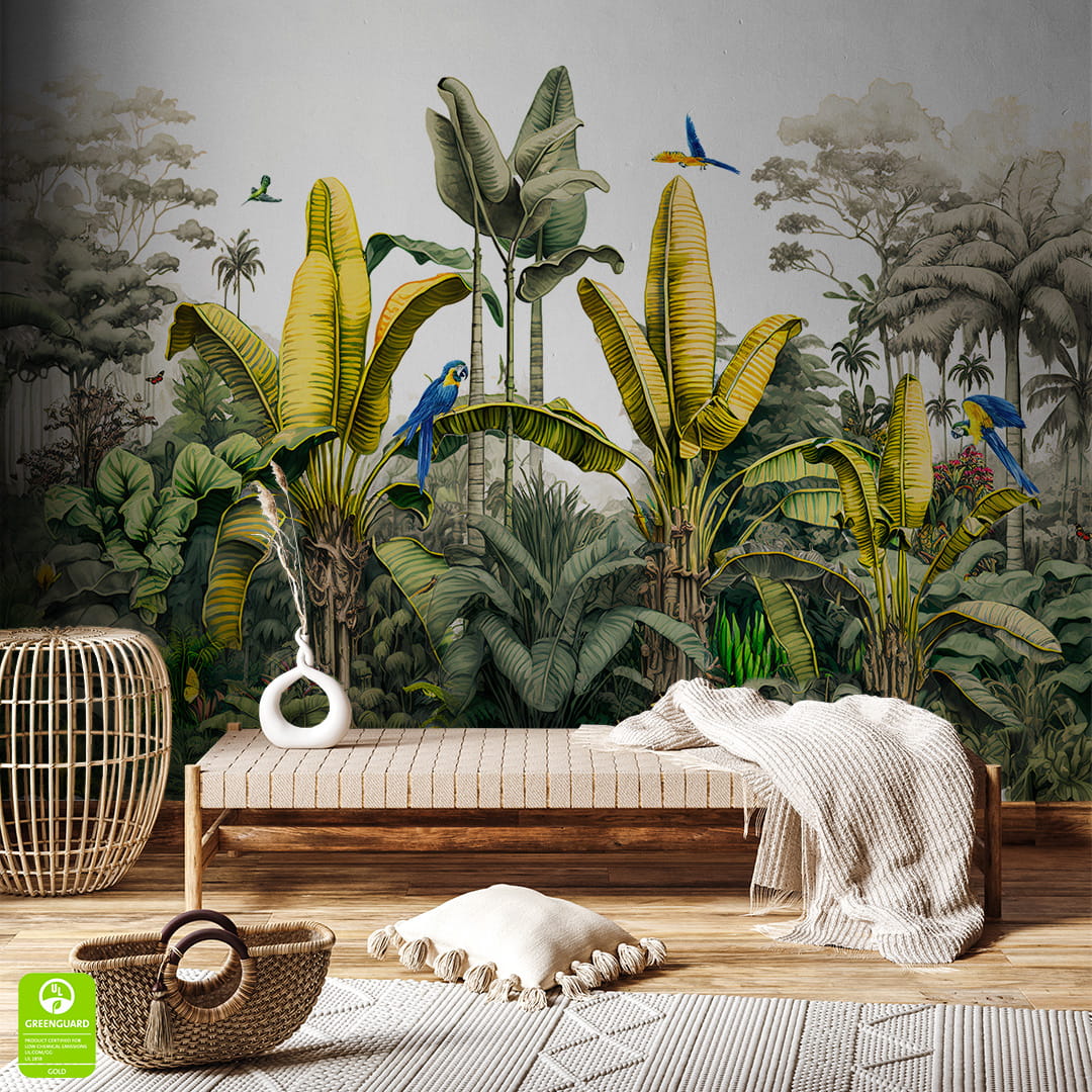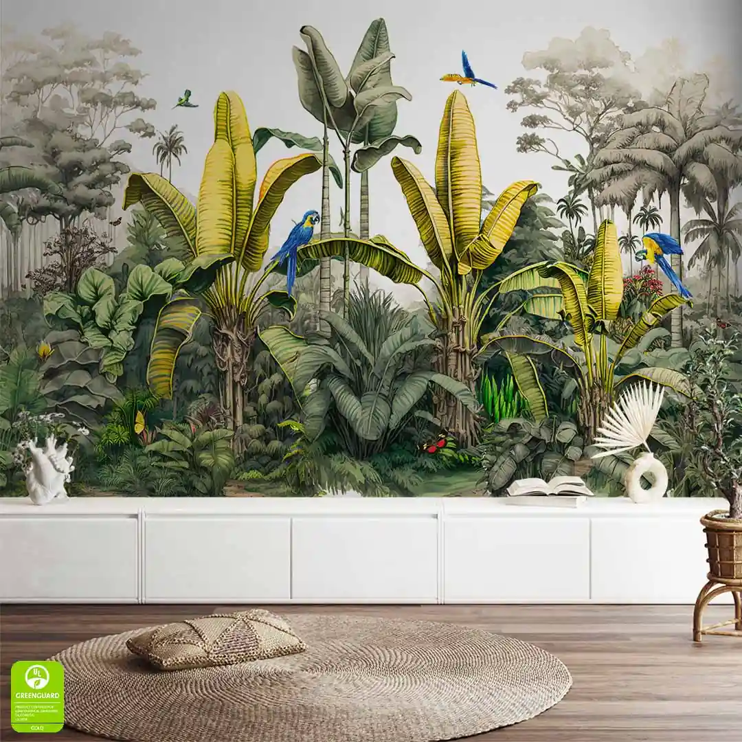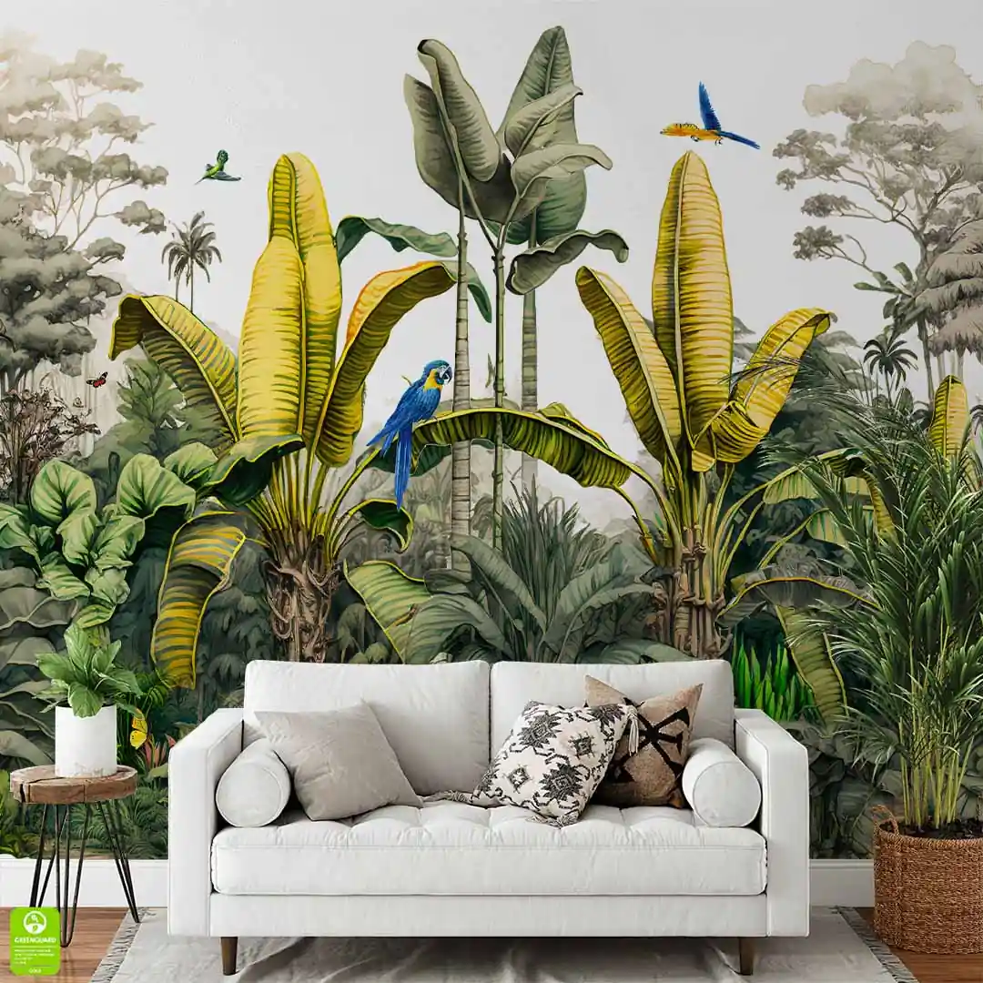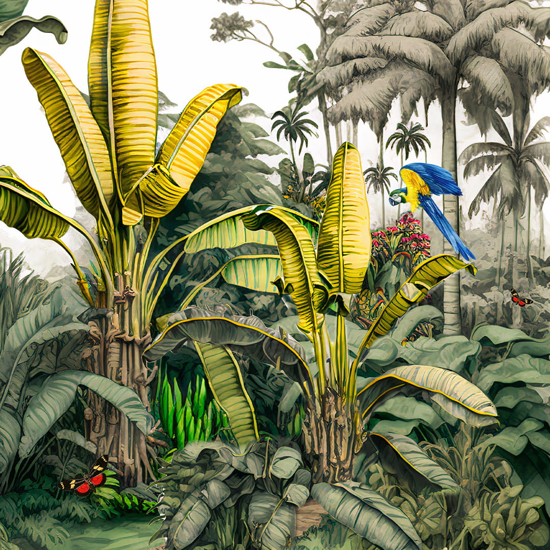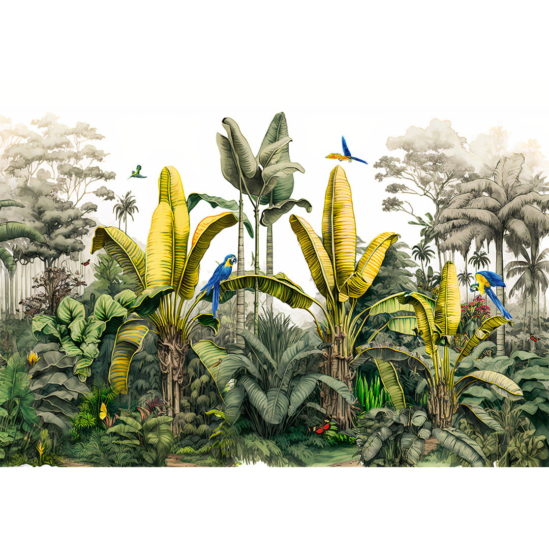 Fototapeta na wymiar, Papugi Dżungla Tropikalna Liście Bananowca, Do Salonu Sypialni, Boho Tropical, Zielona Niebieska Żółta