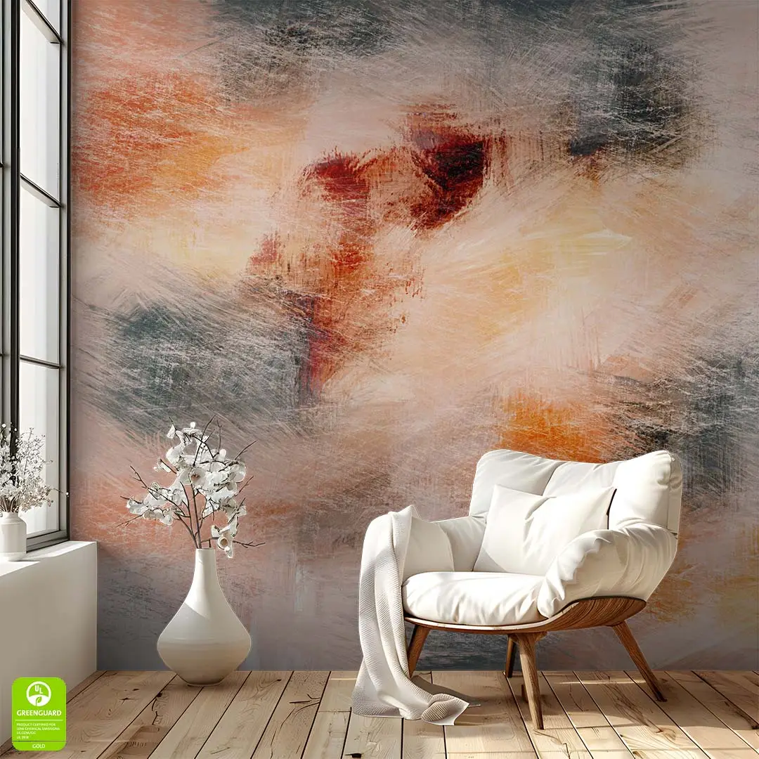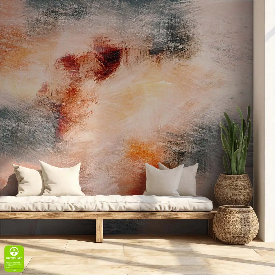 W kolorystyce dominują ciepłe odcienie beżu, pomarańczu i ceglastej czerwieni, przełamane chłodniejszymi akcentami szarości. Takie zestawienie barw sprawia, że pomieszczenie staje się bardziej przytulne i pełne energii. Fototapeta doskonale sprawdzi się w salonie nad kanapą lub w sypialni, tworząc tło, które przyciąga wzrok. Idealnie pasuje do stylu nowoczesnego oraz wnętrz, w których królują naturalne materiały. Wybierz ten motyw, aby wprowadzić do swojego domu ciepły i radosny nastrój!