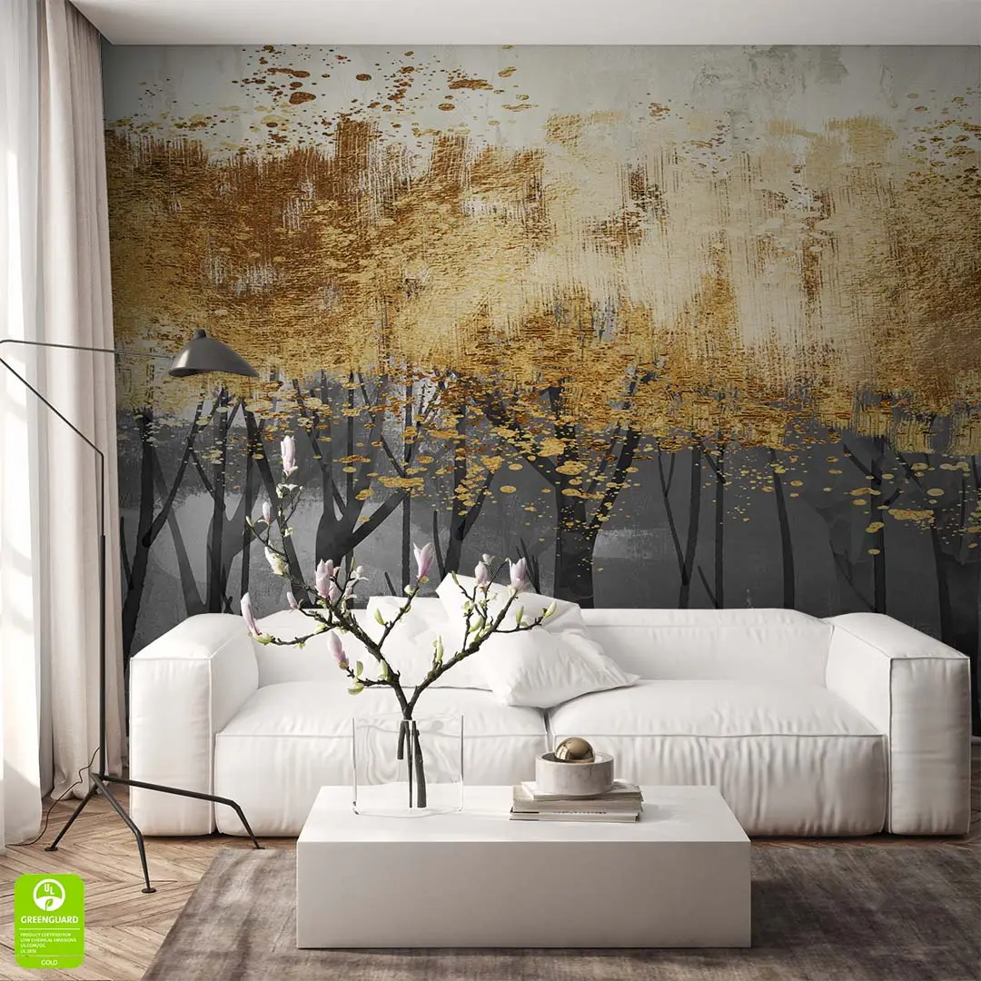 Kolorystyka opiera się na głębokim kontraście – ciemne sylwetki drzew na jasnym tle są rozświetlone ciepłymi, akcentami w kolorze złota. Dzięki temu fototapeta wprowadza do pomieszczenia energię i blask, nie tracąc przy tym elegancji. Doskonale sprawdzi się w reprezentacyjnym salonie, nowoczesnym biurze lub sypialni, w której chcesz uzyskać efekt luksusu. Wybierz ten motyw, jeśli szukasz dekoracji, która zastąpi największy obraz i całkowicie odmieni Twój dom!