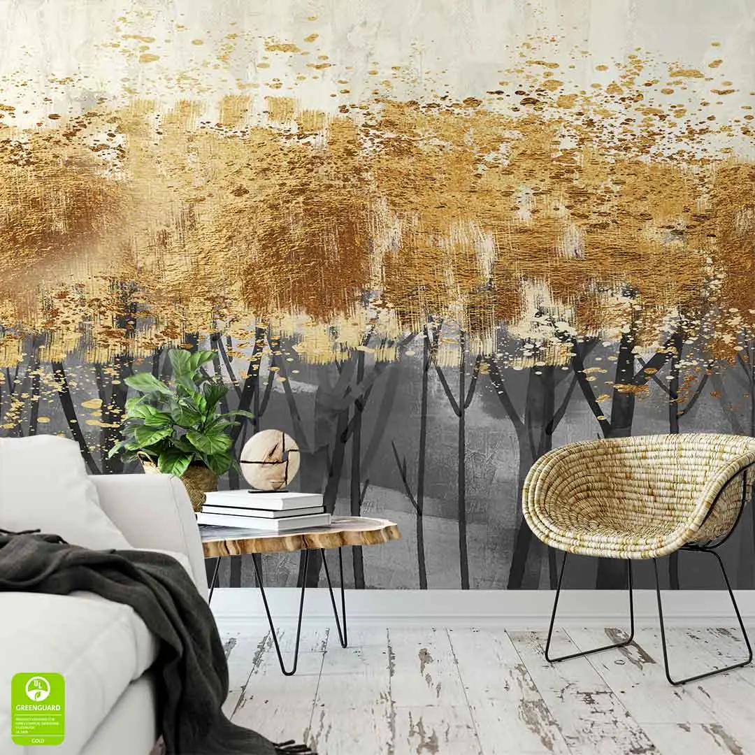 Fototapeta na wymiar - Abstrakcja Złoty Las to dekoracja, obok której nie da się przejść obojętnie. Wzór łączy w sobie dwa światy: minimalistyczny, czarno-biały szkic lasu oraz dynamiczne, bogate pociągnięcia pędzla w kolorze złota. Taka kompozycja nadaje wnętrzu prestiżowy i bardzo nowoczesny wygląd.